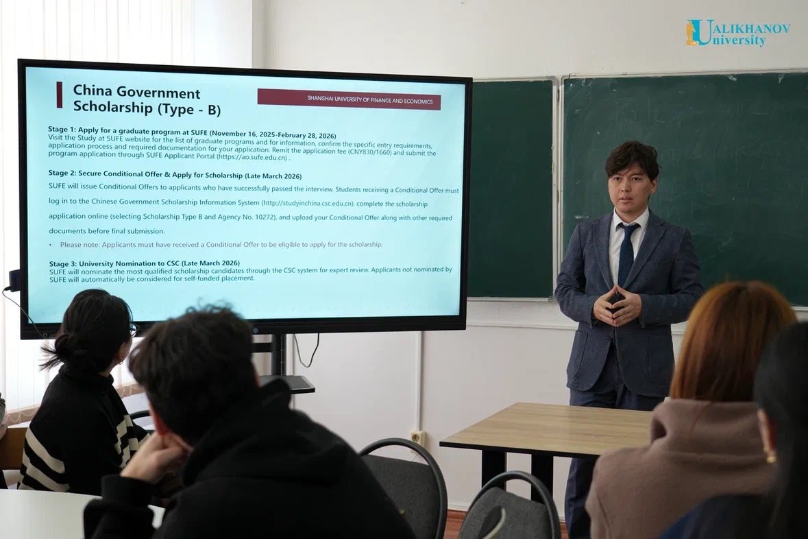 Магистрант SUFE Мейірлі презентовал студентам возможности обучения в одном из ведущих государственных университетов Шанхай, специализирующемся в области экономики, бизнеса и финансов. Он также представил информацию о программах языковой подготовки, бакалавриата, магистратуры и докторантуры, требованиях к иностранным абитуриентам и особенностях учебного процесса. В ходе встречи студенты получили ответы на интересующие их вопросы о поступлении и возможностях обучения в Китае.