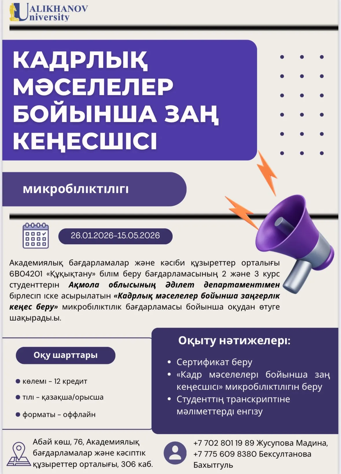 Академиялық бағдарламалар және кәсіби құзыреттер орталығы 6В04201 «Құқықтану» білім беру бағдарламасының 2 және 3 курс студенттерін Ақмола облысының Әділет департаментімен бірлесіп іске асырылатын «Кадрлық мәселелер бойынша заңгерлік кеңес беру» микробіліктілік бағдарламасы бойынша оқудан өтуге шақырады.