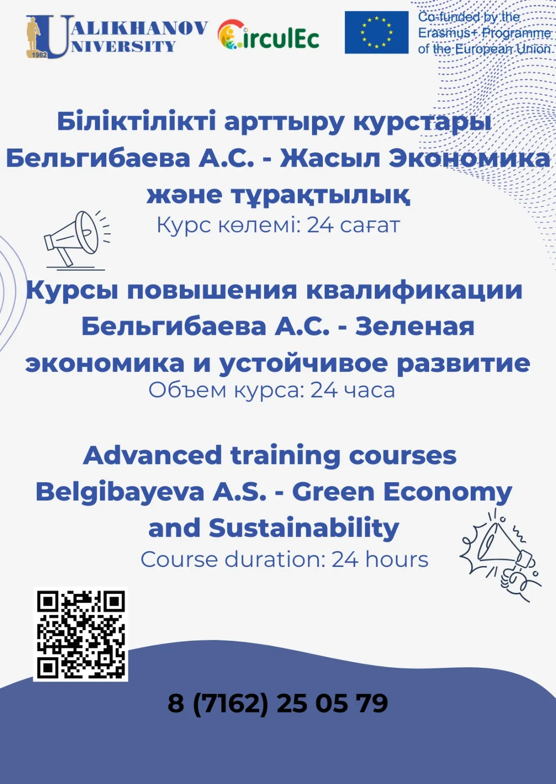 2025 жылғы 15–20 қыркүйек аралығында Ш. Уәлиханов атындағы Көкшетау университетінің үздіксіз білім беру институты «Жасыл экономика және тұрақтылық» тақырыбында сертификат берілетін біліктілікті арттыру курстарын ұйымдастырады.