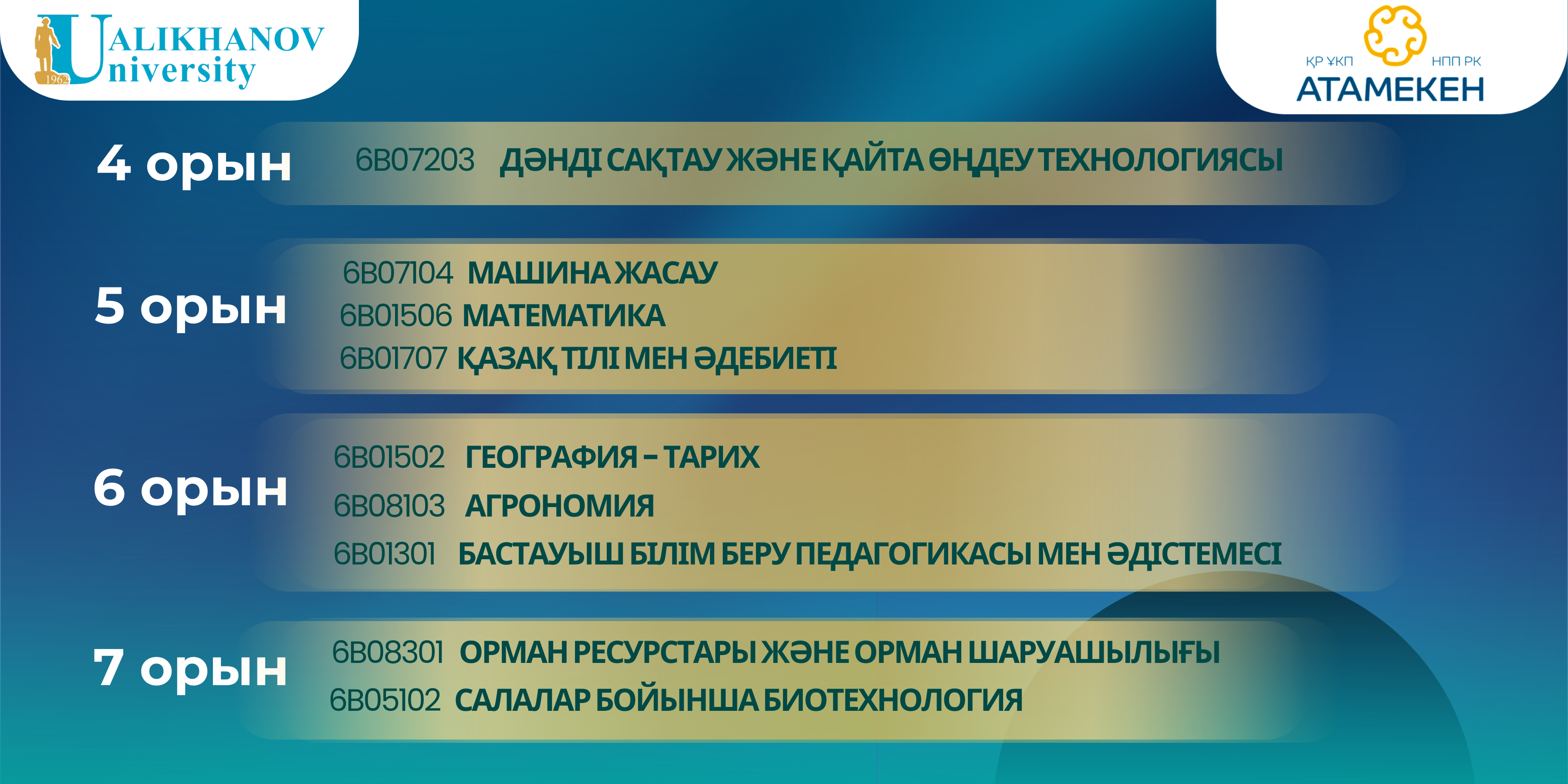 Ualikhanov University 2026 жылғы «Атамекен» Ұлттық кәсіпкерлер палатасының білім беру бағдарламаларының ұлттық рейтингінде ТОП-10 қатарына енді. Университеттің бірқатар білім беру бағдарламалары Қазақстан Республикасындағы үздік білім беру бағдарламаларының қатарына еніп, мамандар даярлау сапасының жоғары деңгейін көрсетті.
