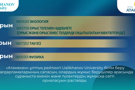 Ualikhanov University-дің «Атамекен» рейтингіндегі жоғары нәтижелері университеттің білім беру бағдарламаларын дамыту бағытында жүргізіп отырған жүйелі жұмысының тиімділігін дәлелдейді. Университет оқу жоспарларын тұрақты түрде жаңартып, заманауи білім беру технологияларын, практикалық бағыттағы тәсілдерді және кәсіби орта талаптарын оқу үдерісіне енгізіп келеді.