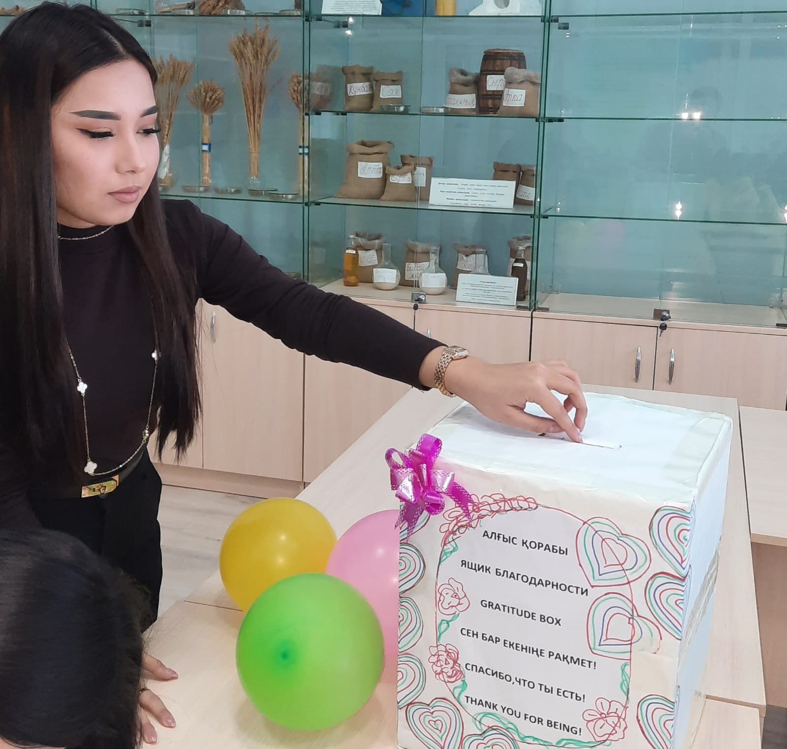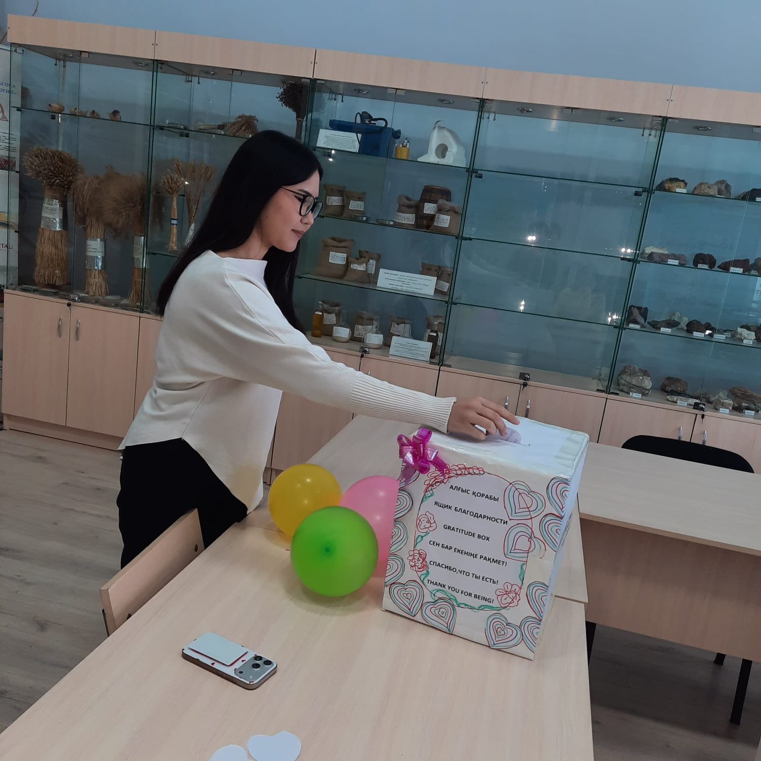 Сондай-ақ, университет психологы Мазбаева Гүлден Амантаева Алғыс айту күніне орай жатақханада студенттер арасында «Жайлы жағдай жасауға үйрету» атты тренинг өткізді. Тренинг студенттерді біріктіруге және алғыс білдіру мәдениетін қалыптастыруға бағытталды. Негізгі әдістер ретінде рөлдік ойындар, пікірталас, достық қарым-қатынас орнату, қызығушылық пен сенімге негізделген байланыстарды дамыту, сондай-ақ эмоционалдық эмпатияға баса назар аударылды.