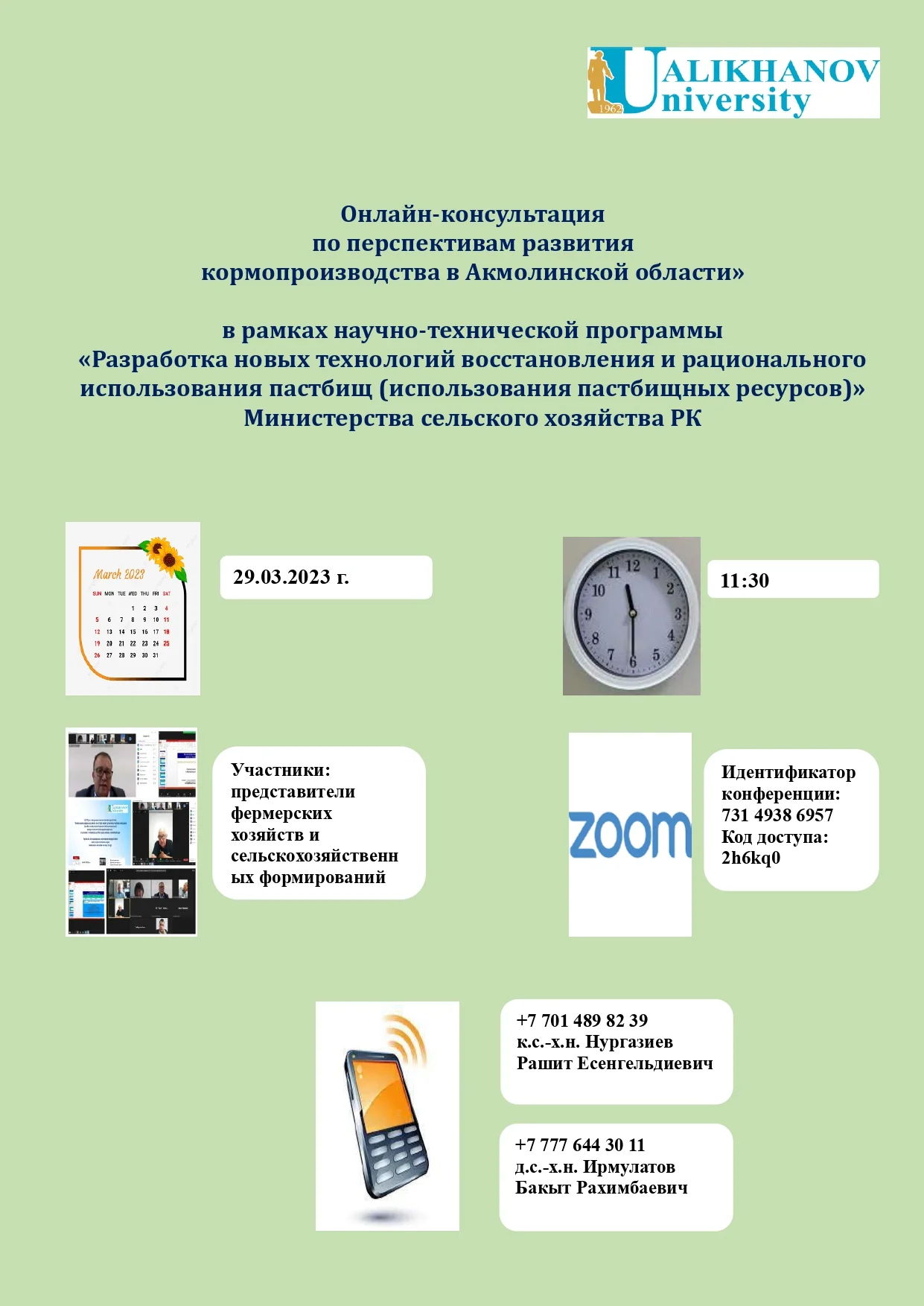 29 марта 2023 года в рамках НТП ПЦФ МСХ РК BR10764915 «Разработка новых технологий восстановления и рационального использования пастбищ (использование пастбищных ресурсов)» в Кокшетауском университете имени Ш.Уалиханова в 11.30 часов состоится онлайн-консультации по вопросам кормопроизводства с участием доктора с/х наук Ирмулатова Б.Р. и кандидата с/х наук Нургазиева Р.Е.