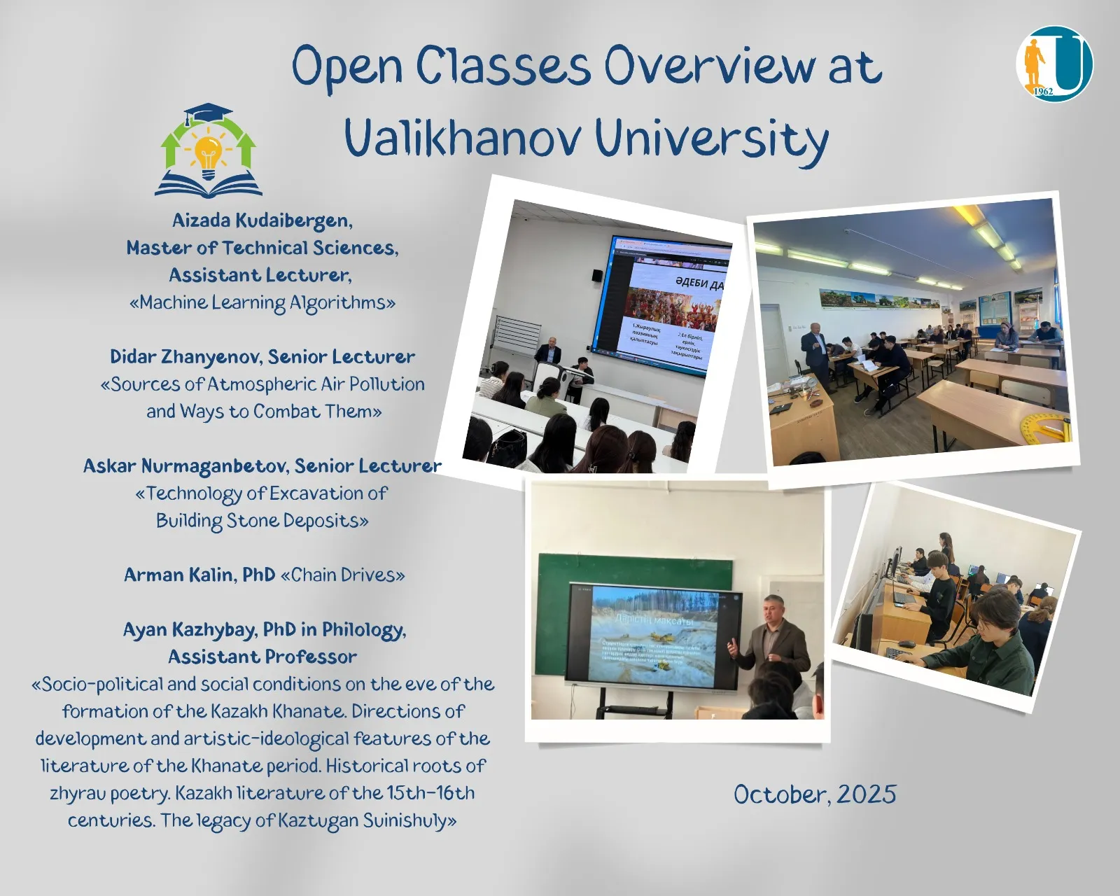 - Department of Mining, Construction and Ecology – Senior Lecturer Didar Berikovich Zhanyenov on the topic: “Sources of Atmospheric Air Pollution and Ways to Combat Them.”