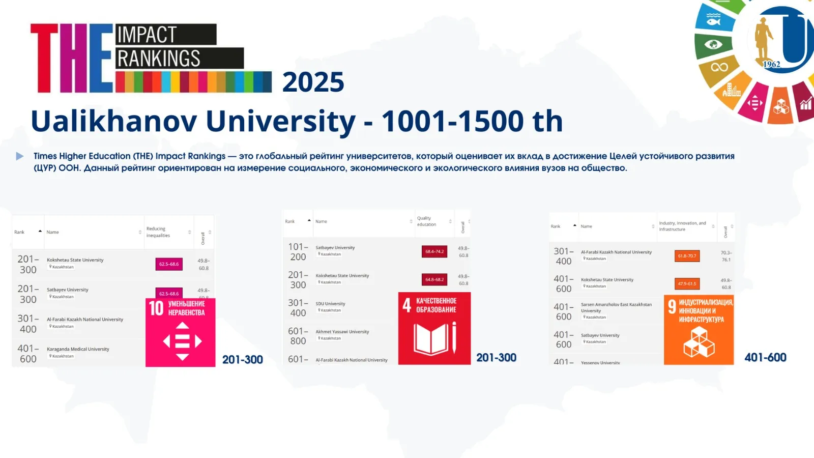 QS жаһандық рейтингтері бойынша Азияда – 640-орын, Орталық Азияда – 41-орын