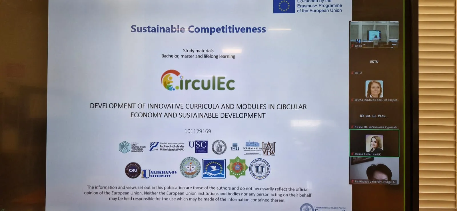 Оқу Erasmus+ KA2 CBHE 101129169 жобасы аясында "Айналмалы экономика және тұрақты даму саласындағы инновациялық оқу бағдарламалары мен модульдерін әзірлеу (CirculEC)" жобасы аясында ұйымдастырылған. Тренинг аралас форматта жүргізілуде. Әрбір серіктес университеттен 2 оқытушы офлайн форматта, ал жұмыс топтарының қалған мүшелері онлайн форматта қатысып келеді.