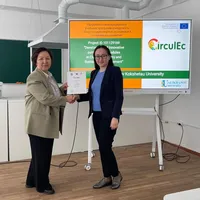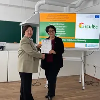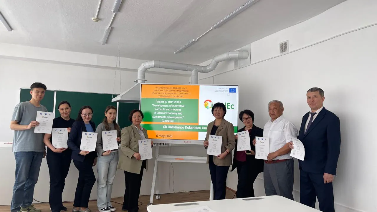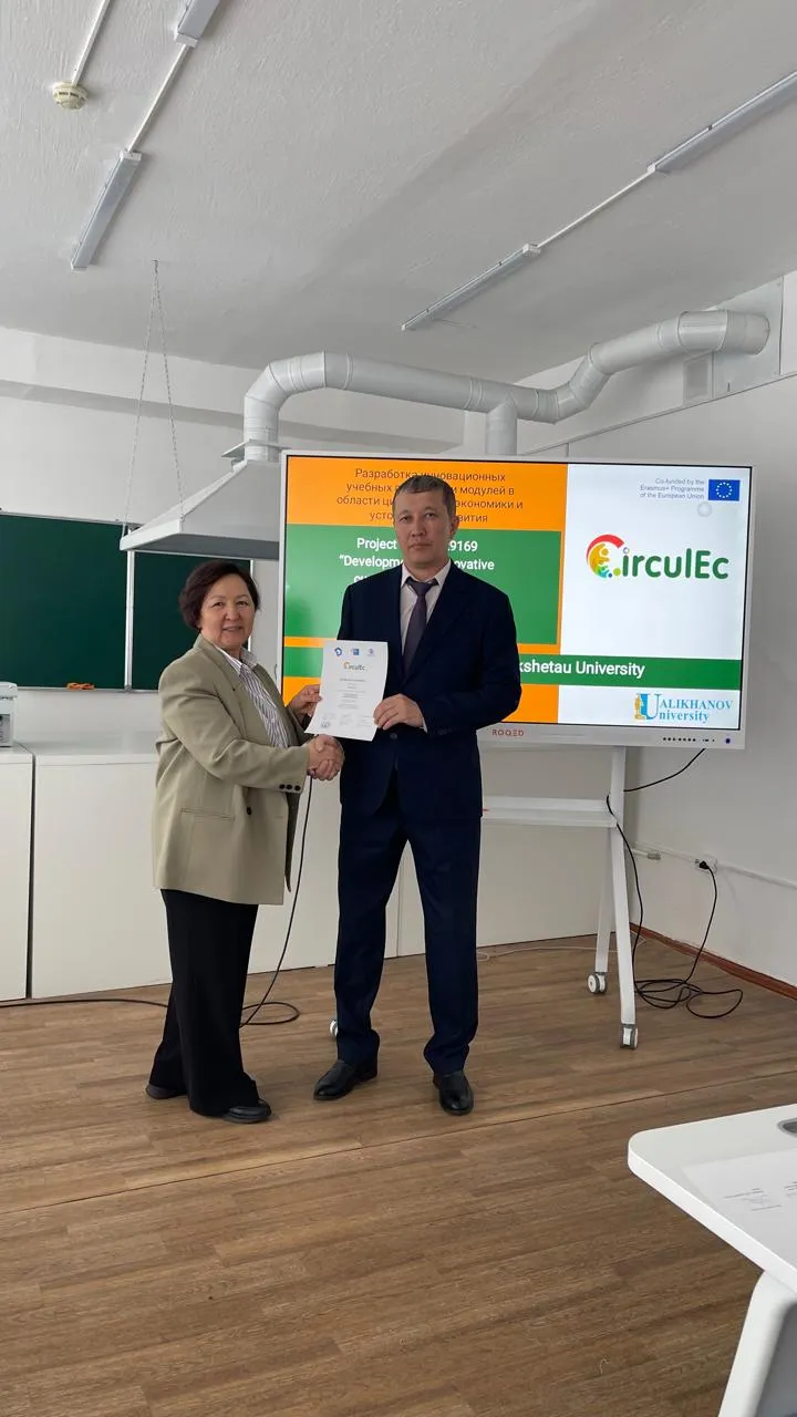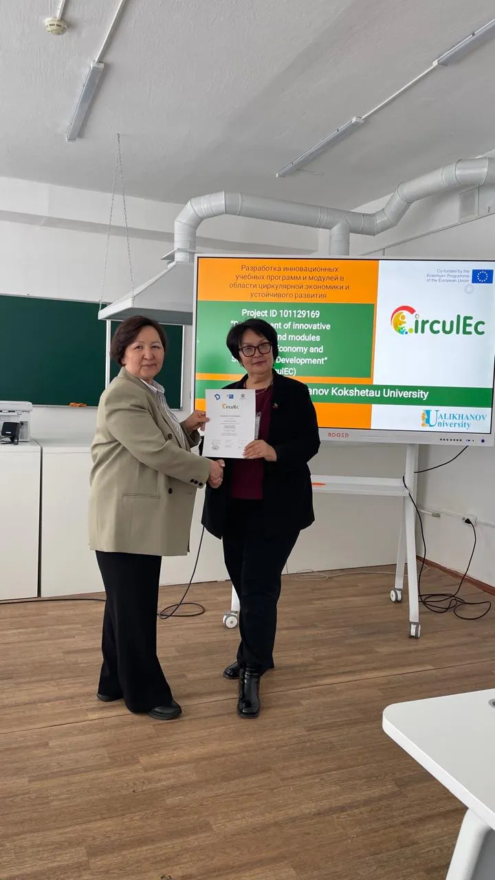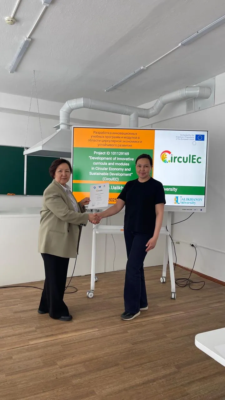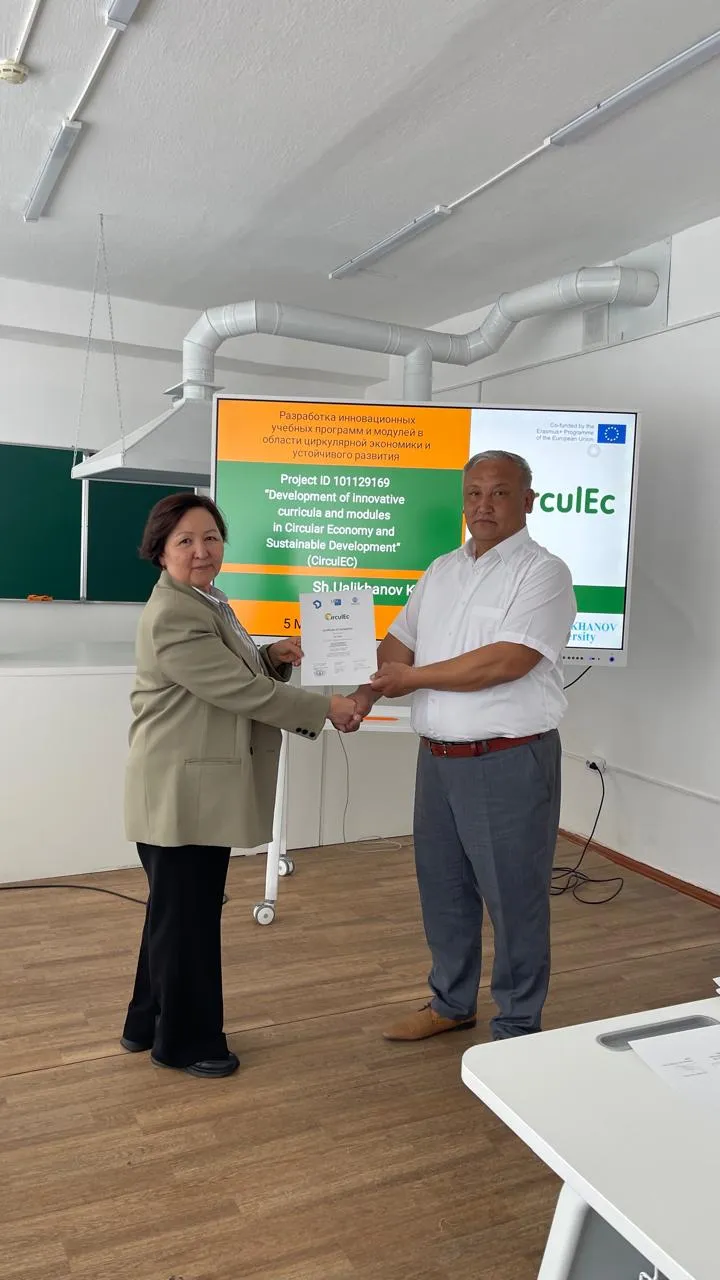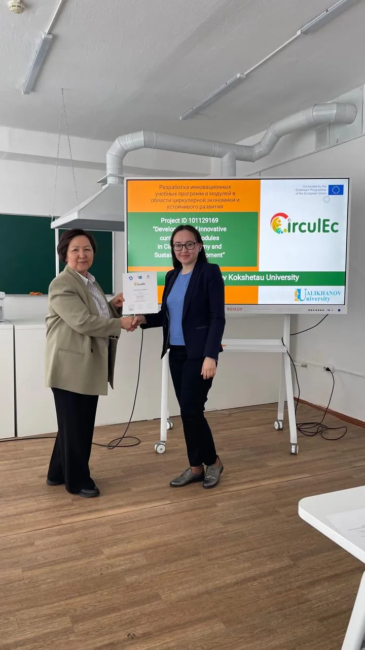 2025 жылғы 5 мамырда Ш.Уәлиханов атындағы Көкшетау университетінің интернационалдандыру және инфрақұрылымды дамыту жөніндегі проректор міндетін атқарушы Курманбаева А.С. CBHE Erasmus+ жобасы аясында ұйымдастырылған “Айналмалы экономика және тұрақты даму саласында инновациялық оқу бағдарламалары мен модульдерін әзірлеу (CirculEC)” атты тренингтер сериясына қатысушыларға сертификаттар табыстады.