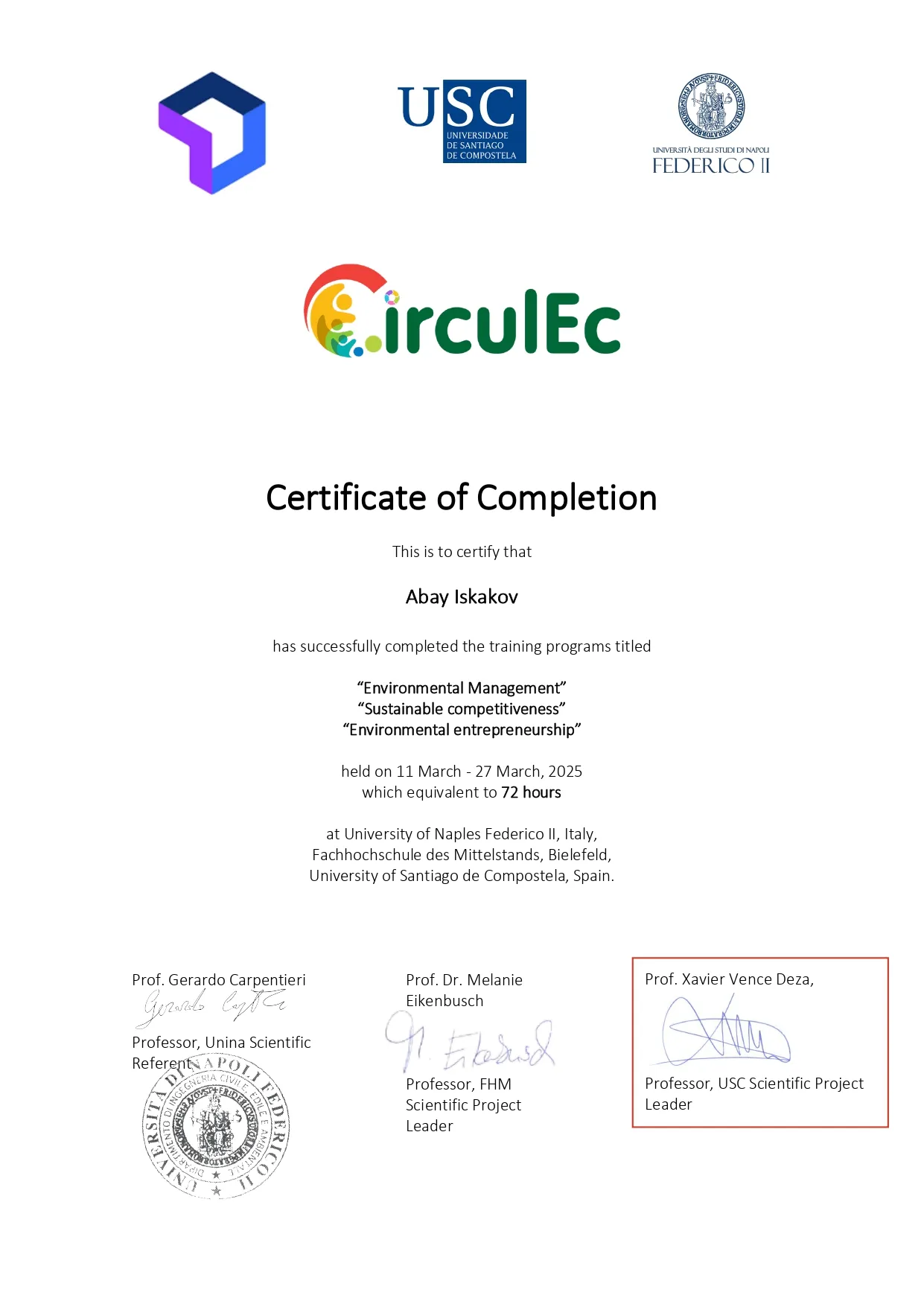 2025 жылғы 11–27 наурыз аралығында CirculEC жобасының еуропалық серіктес жоғары оқу орындары (Италия — Неапольдегі Федерико II университеті; Германия — Fachhochschule des Mittelstands; Испания — Сантьяго-де-Компостела университеті) тарапынан тренингтер офлайн және онлайн форматта ұйымдастырылып, өткізілді.