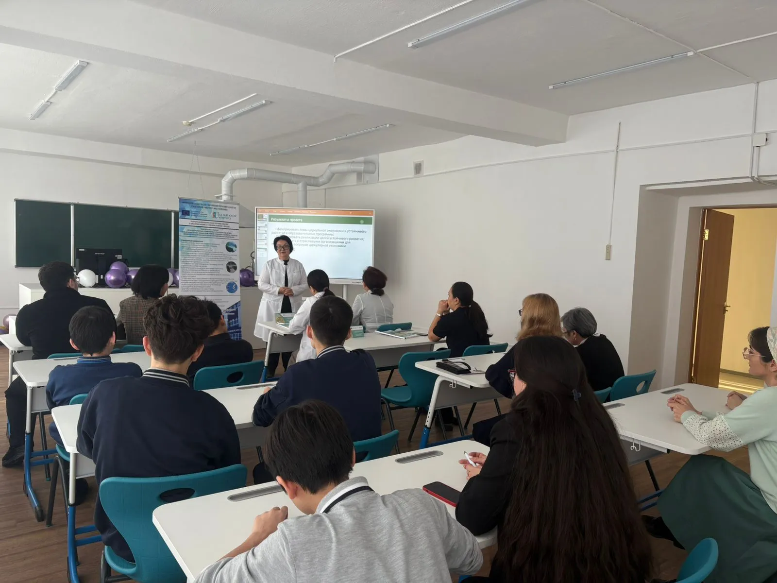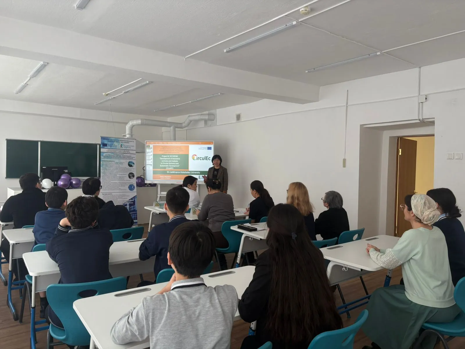 CirculEC Kokshetau University командасының мүшелері Нұрмұханбетова Нұргүл мен Бельгибаева Анаргуль жоба туралы сұрақтарға жауап беріп, CirculEC жобасының іске асырылу барысы туралы ақпаратпен бөлісті. Олар сондай-ақ айналмалы экономика және тұрақты даму тақырыбын білім беру бағдарламаларына интеграциялауды қамтитын жобаның нәтижелері; тұрақты даму мақсаттарын іске асыруға ықпал ету; айналмалы экономика мәселелерін зерттеу үшін салалық ұйымдармен ынтымақтастық туралы айтты.