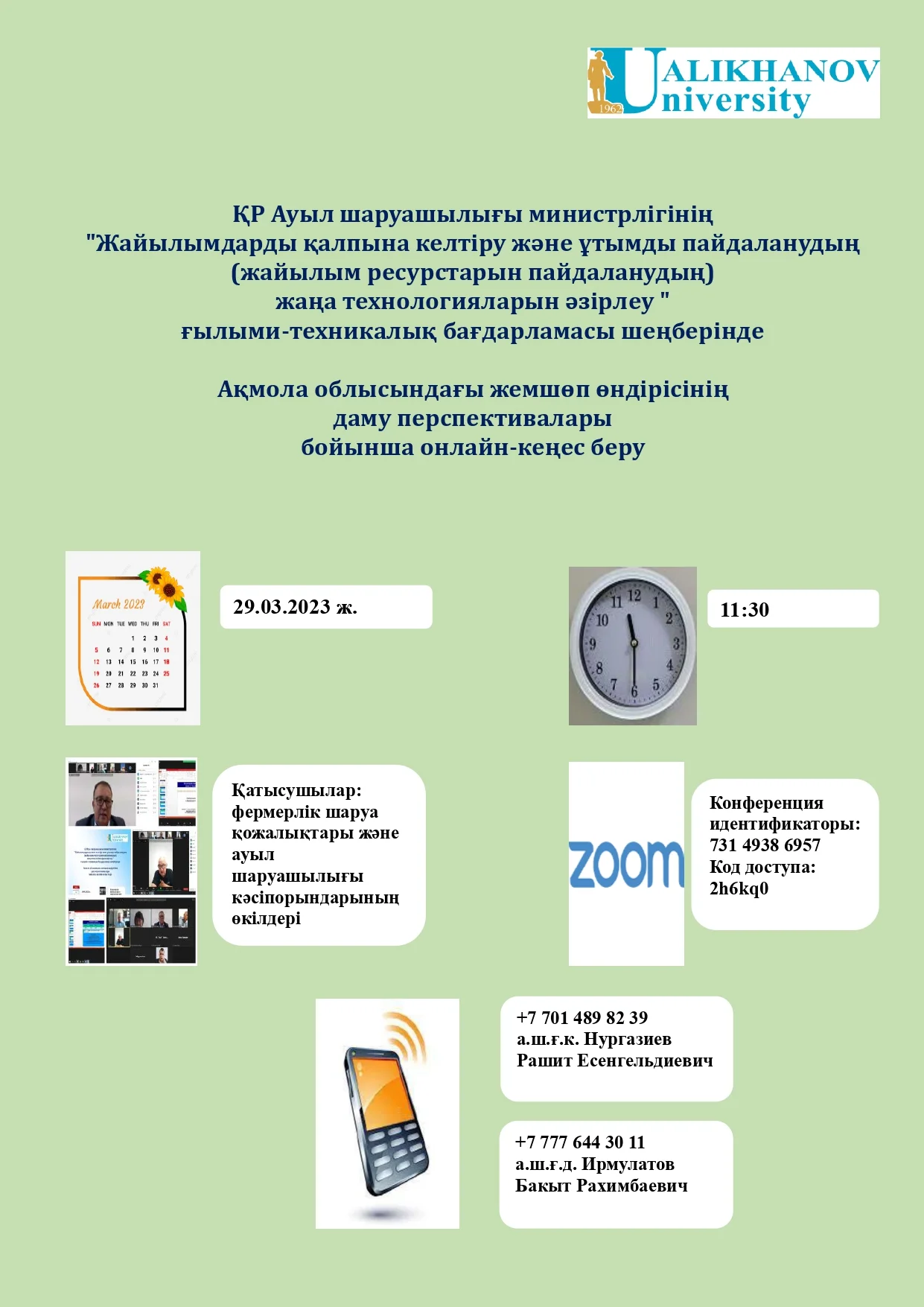 2023 жылғы 29 наурызда ҚР АШМ BR10764915 «Жайылымдарды қалпына келтіру және ұтымды пайдаланудың (жайылым ресурстарын пайдаланудың) жаңа технологияларын жасақтау» ғылыми-техникалық бағдарламасының аясында Ш.Уәлиханов атындағы Көкшетау университетінде сағат 11.30 а.ш.ғ. докторы Б.Р. Ирмулатов және а.ш.ғ. кандидаты Р.Е. Нургазиевтің қатысумен мал азығы өндірісі сұрақтары бойынша онлайн-консультациялар өткізіледі.