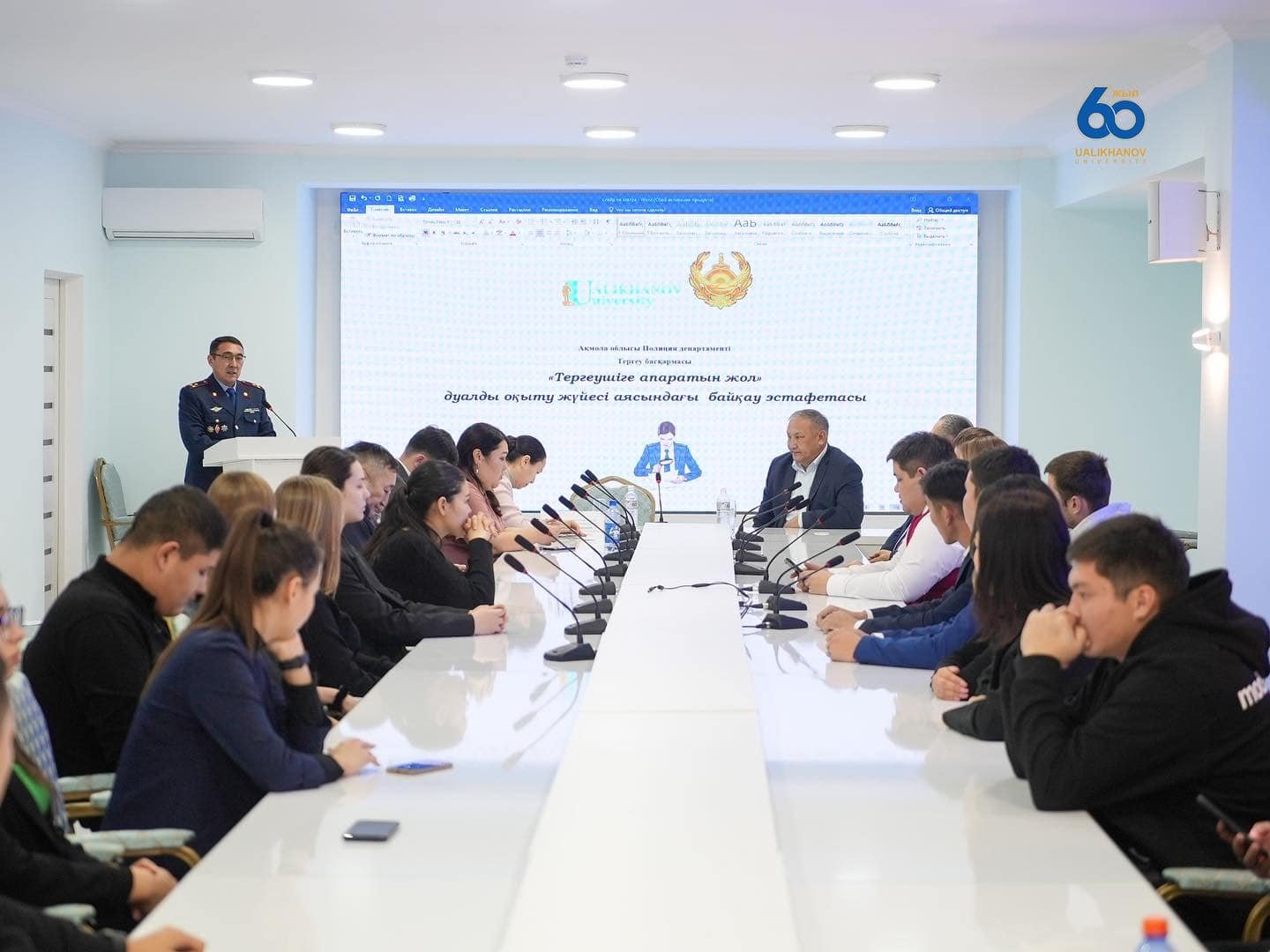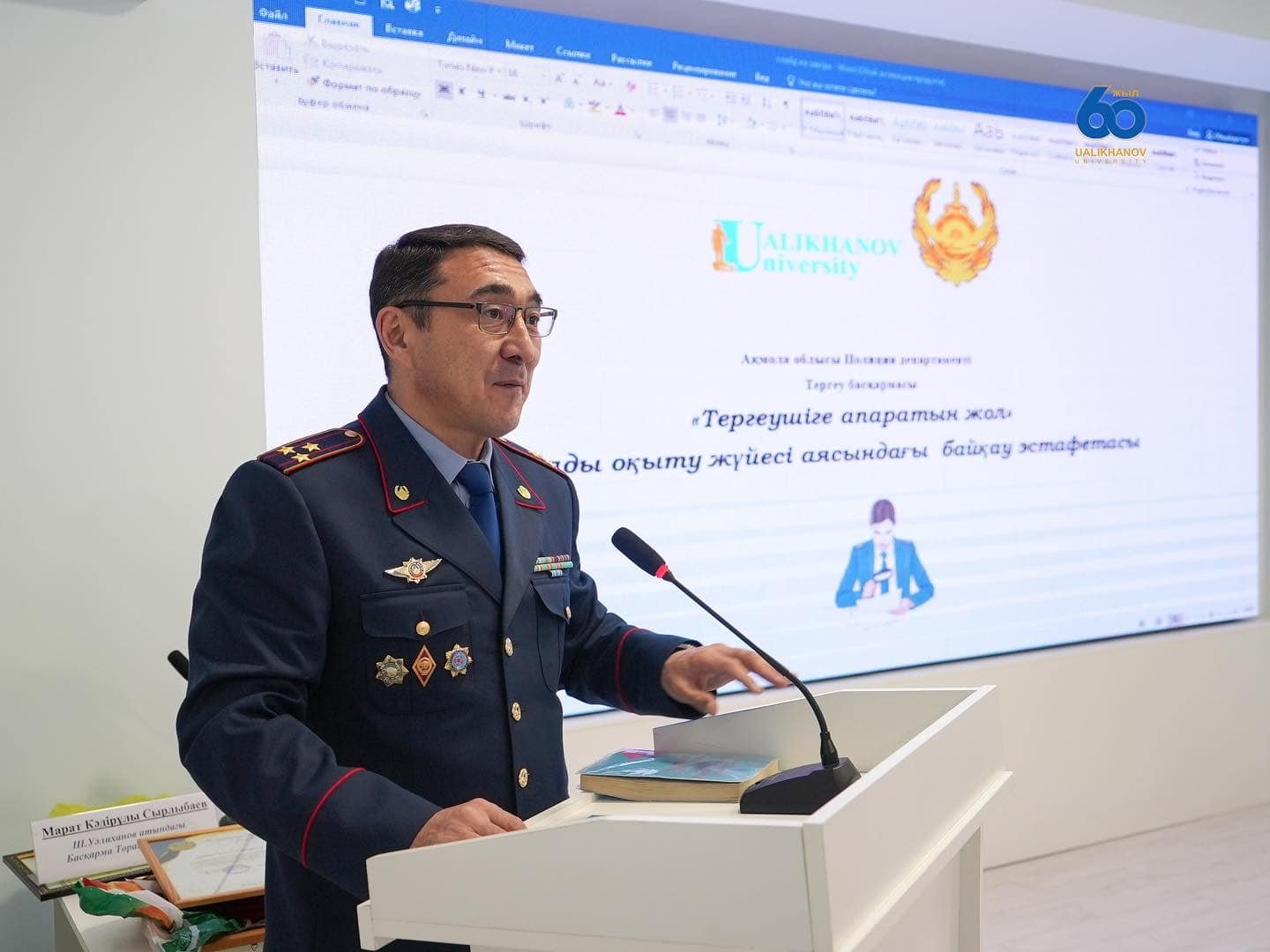 16 ноября 2022 года в стенах университета им. Ш.Уалиханова произошло знаковое событие. Была принята эстафета " Тергеушіге апаратын жол" от КазНУ им. Аль - Фараби. Торжественное приняти прошло при непосредственном участии Начальника следственного управления ДП Акмолинской области Жуманова Талгата Дауренбековича. Комплекс мероприятий практического сотрудничества Департамента полиции и кафедры Права КУ им. Ш Уалиханов в рамках утрерденного плана повысит качество образовательного процесса и приобретение необходимых компетенций студентов Образовательной программы 5В030100 " Юриспруденция". Следует отметить высокую степень сотрудничества со всеми правоохранительными органами, которые участвуют в разработке образовательных пограмм, организации и проведений практических занятий на филиалах кафедры и профессиональной практики на выпускных курсах.