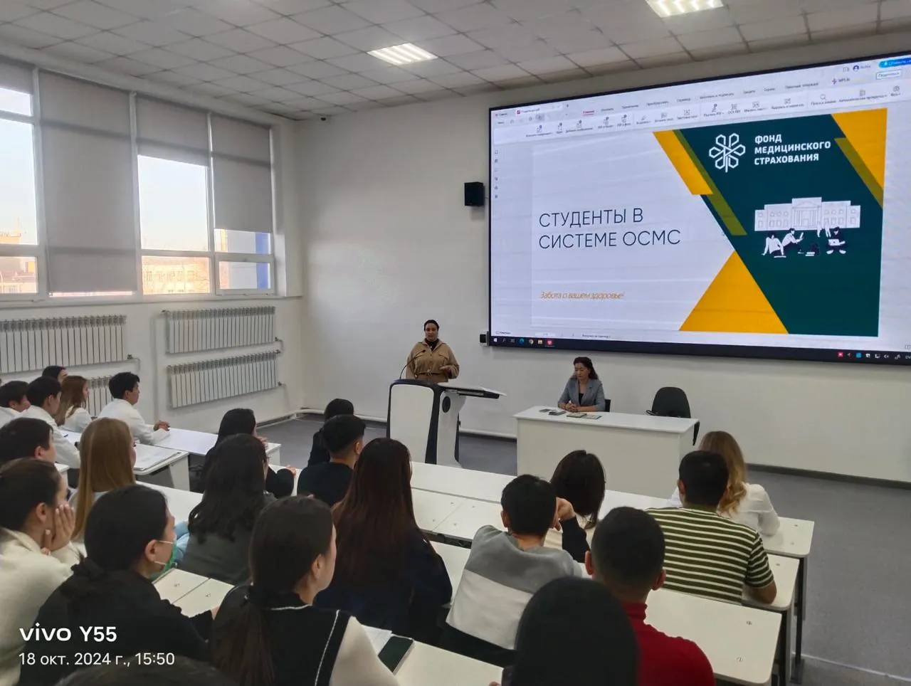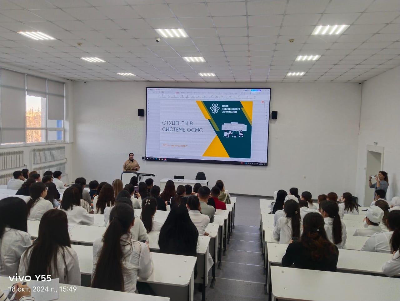 2024 жылғы 18 қазанда Медицина жоғары мектебінің 4-5 курс студенттері міндетті әлеуметтік медициналық сақтандыру (МӘМС) мәселелері бойынша ақпараттық-түсіндіру жұмысына қатысты. Бұл іс-шараны «Медициналық сақтандыру қоры» КЕАҚ Ақмола облыстық филиалы ұйымдастырды. Кездесу барысында МӘМС жүйесінің негізгі аспектілері, оның артықшылықтары, азаматтардың міндеттемелері және осы бағдарлама аясында медициналық қызметтерді алу үдерісі талқыланды. Студенттер өздерін қызықтырған сұрақтарын қойып, Қазақстандағы медициналық сақтандыру жүйесінің жұмыс істеу механизмдері туралы көбірек мәлімет алды.
