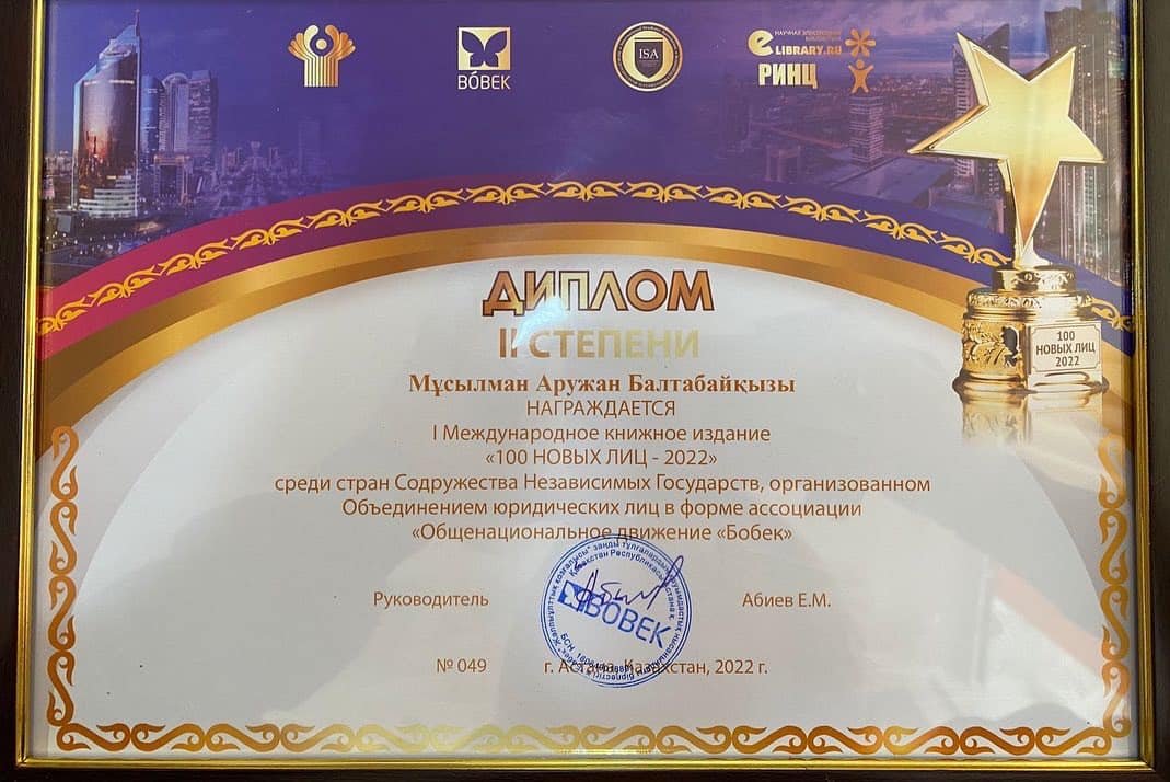 25.11.2022 года студентка 4 курса высшей школы медицины Мұсылман Аружан была награждена дипломом II степени в конференции «100 новых лиц СНГ-2022» среди стран Содружества Независимых Государств, организованном Объединением юридических лиц в форме ассоциации "Общенациональное движение "Бобек" г.Астана