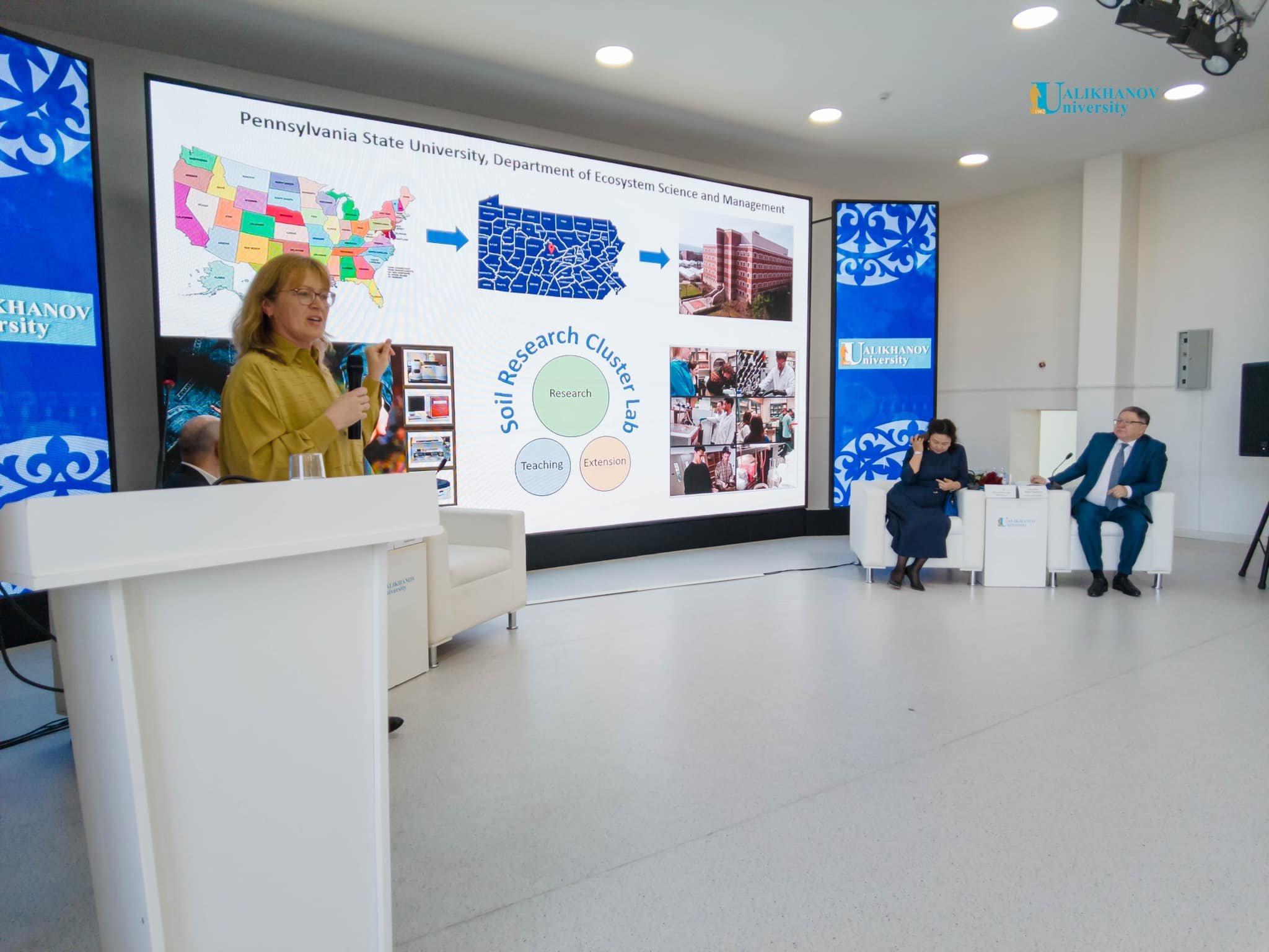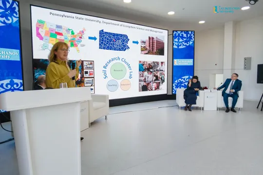 Бүгін конференцияның пленарлық отырысына Қазақстан Ұлттық Ғылым академиясының вице-президенті Д.Ж.Сарбасов, Ахмет Байтұрсынов атындағы Тіл білімі институтының директоры А.М.Фазылжан, Pennsylvania State University профессоры және топырақты зерттеу кластерлік зертханасының директоры Екатерина Базилевская, Penn State Global серіктестік келісімдері жөніндегі директордың орынбасары Влад Лихолетов, Вашингтон университетінің PhD докторы Талант Мауканұлы, Назарбаев Университетіндегі жобалық кеңсенің аға менеджері А.М Балтабаева, филология ғылымдарының кандидаты А.Р Сулькарнаева, Назарбаев Университетіндегі өнеркәсіппен байланыс және коммерцияландыру кеңсесінің бас менеджері Д.М. Бердыханова қатысты.