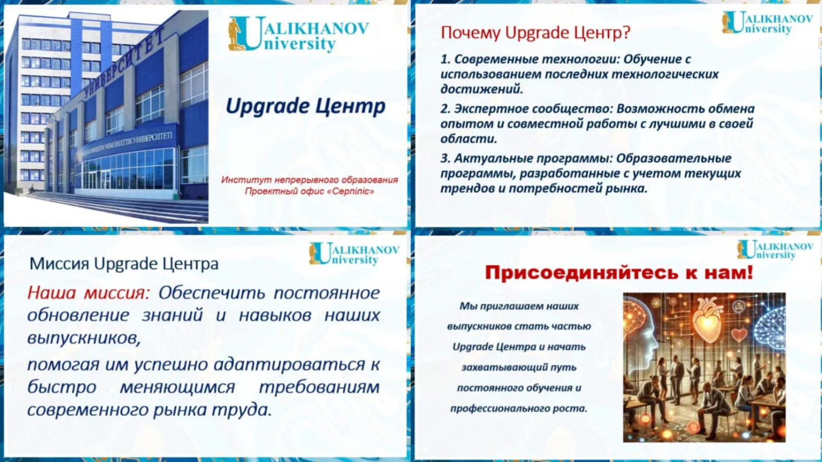 2024 жылдың 26 желтоқсанында Upgrade орталығының «Эмоционалды интеллект» пәні бойынша кезекті жетілдіру курсы аяқталды. Уәлиханов атындағы университеттің түлектері сабақтарға тегін негізде қатысып, курсты сәтті аяқтағаны туралы ресми сертификаттарға ие болды.