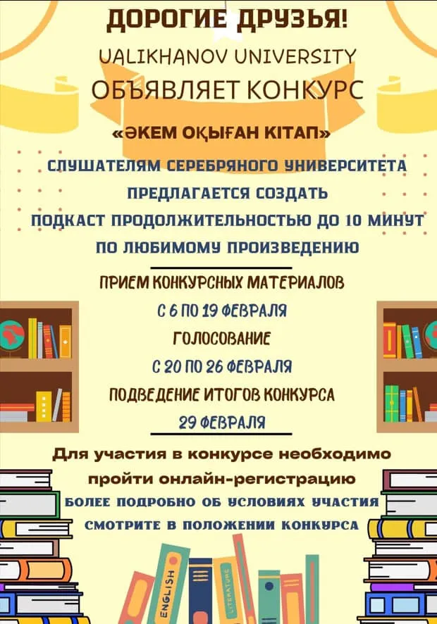 Құрметті Достар! 2024 жылғы 8 ақпанда «Оқитын мектеп – оқитын ұлт»қазақстандық жобасы аясында Ш. Уәлиханов атындағы КУ жанындағы Күміс университетінің тыңдаушыларына арналған байқау басталды.