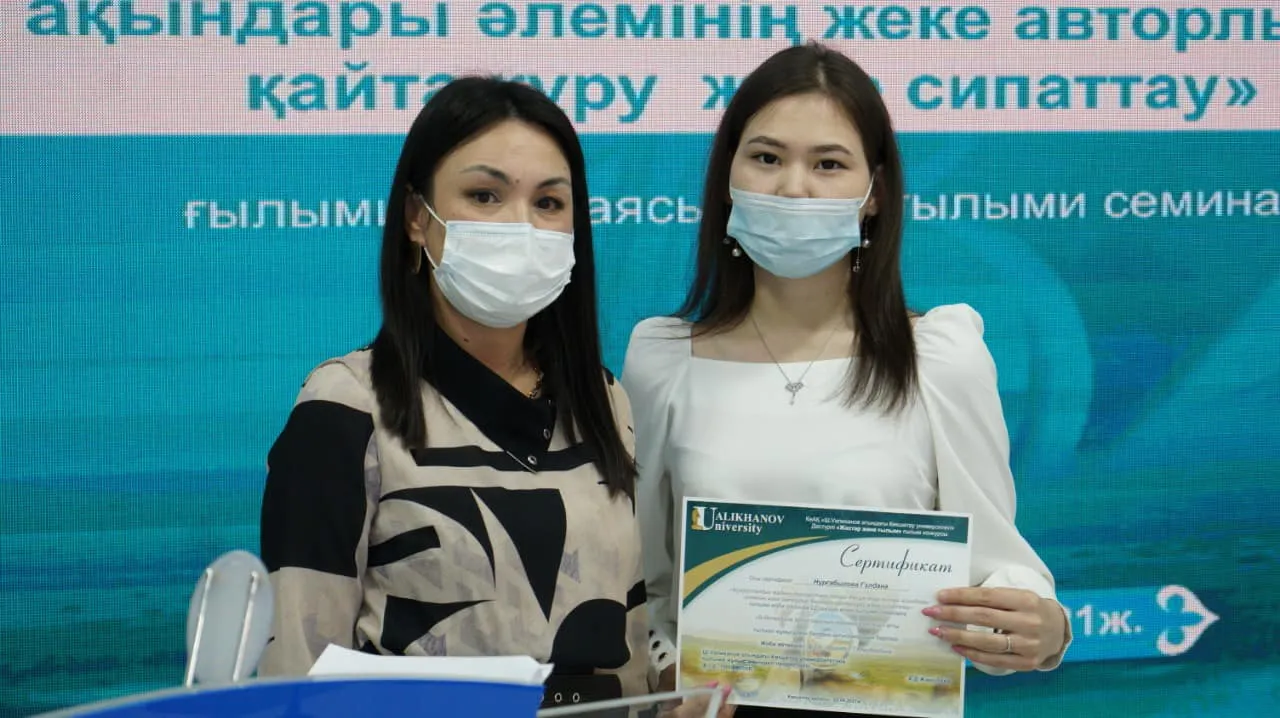 Қазақ тілі мен әдебиеті кафедрасы білім беру бағдарламаларының 4 курс студенті Нұрғабылова Гүлдана Бауыржанқызы Л.Гумилев атындағы Еуразия Ұлттық университетінде өткен студенттердің республикалық ғылыми -зерттеу конкурсында «Баянғали Әлімжанов айтыстарының көркемдік ерекшелігі» ғылыми жобасымен жүлделі 3 орынға ие болды. Ғылыми жетекшісі: ф.ғ.к., қауымдастырылған профессор Гүлден Тоқатқызы Тлеубердина. Айта кетейік Гүлдана Бауыржанқызы 2020 жылдан бері, 1 курс студенті болса да Гүлден Тоқатқызының жетекшілігімен «Қазақстандық мәдени дискурстағы қазіргі Көкше өңірі қазіргі айтыс ақындары әлемінің жеке авторлық бейнесін қайта құру және сипаттау» жобасы аясында алғаш ғылымға бет бұрып,белсенді жұмыс істеуді бастаса, бүгінде ҚР ҒжЖБ министрлігінің гранттық қаржыландырумен жүзеге асырылып жатқан «Қазіргі қазақ айтысының типологиясы мен поэтикасы» атты ғылыми жобасы аясында да табысты ғылыми нәтижелерге қол жеткізуде. Гүлден Тоқатқызының студенттері ғылыми жұмыстар байқауларына белсенді қатысып, жыл сайын жүлделі орындарға ие болуда. Талаптарыңызға нұр жаусын, ғылым жолындағы жетістіктеріңіз арта берсін. Жүлделеріңіз құтты болсын!