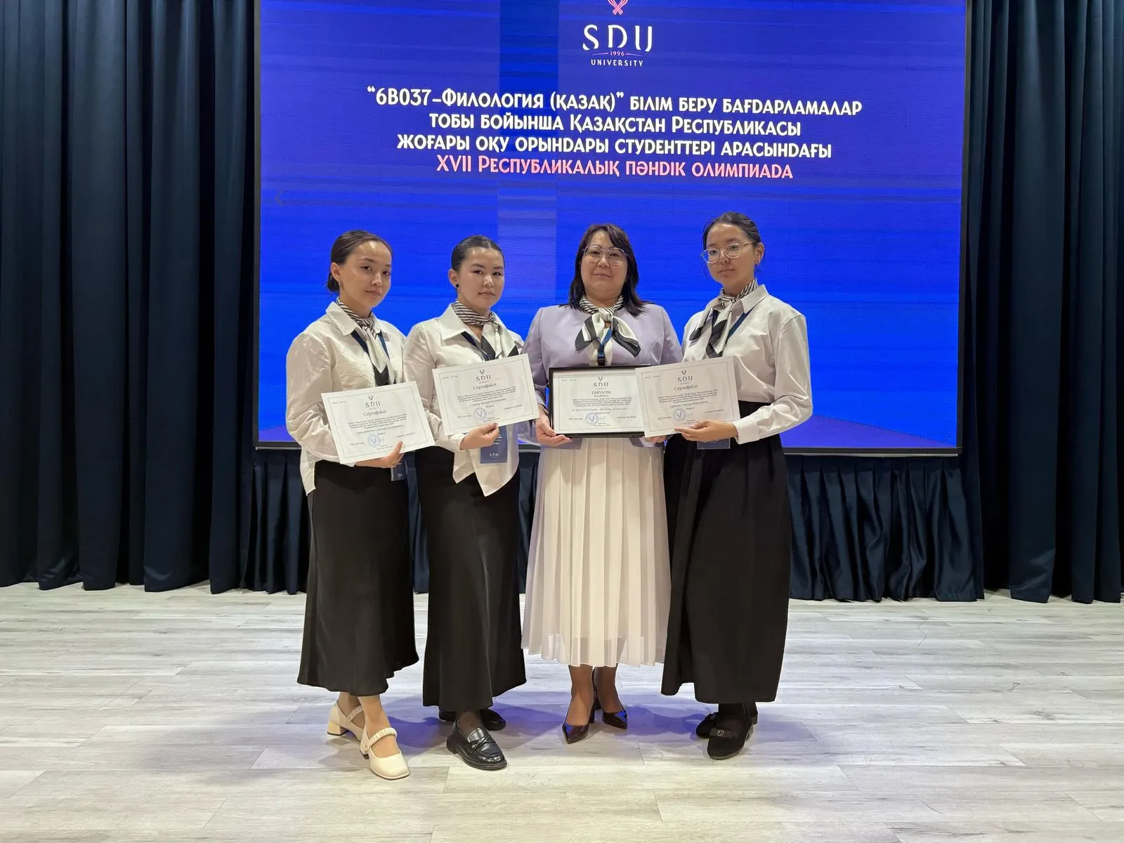 3. 2025 жылдың 24 сәуірінде Алматы облысы, Қаскелең қаласының “SDU UNIVERSITY” мекемесінде ҚР жоғары оқу орындары студенттері арасында “6В02301 - Филология: қазақ филологиясы” БББ бойынша XVII Республикалық пәндік олимпиадасында PhD, проф.ассист. Б.Қ. Шагирбаеваның жетекшілігімен “6В02301 - Филология: қазақ филологиясы” білім беру бағдарламасының студенттері Ермагамбетова Сандуғаш, Карабаева Эльнура, Серпер Айгерім жүлделі 3-орынға ие болды.