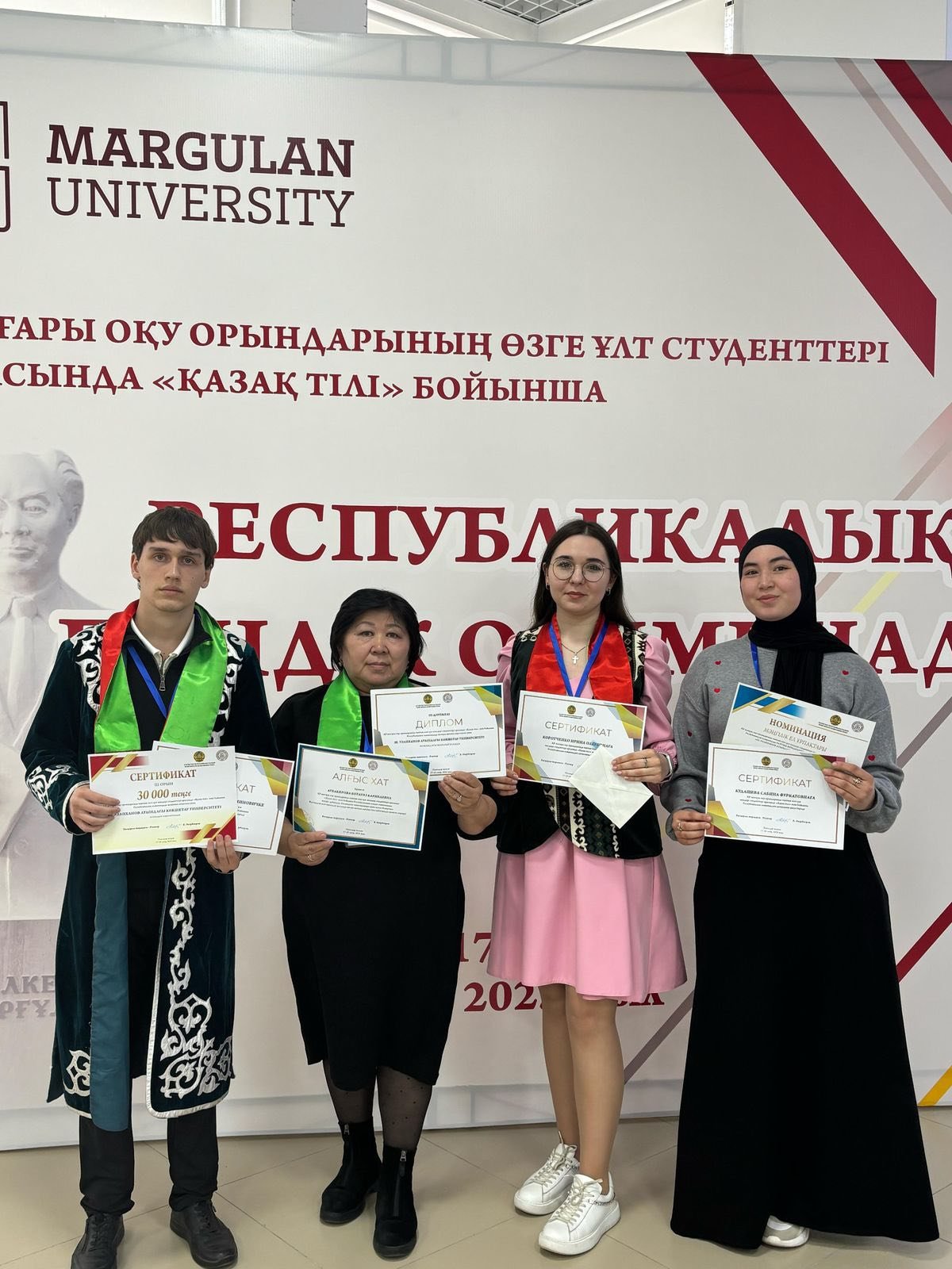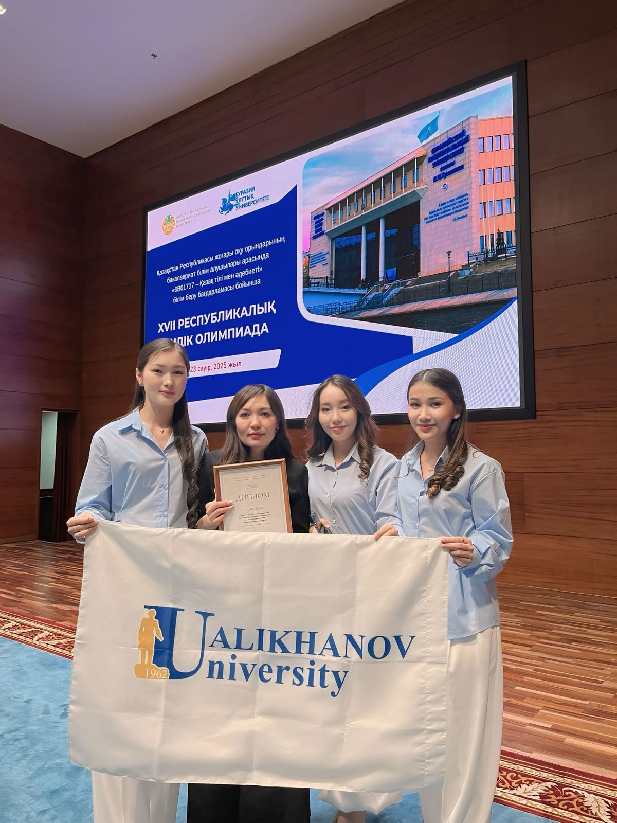 2. 2025 жылдың 22-23 сәуір аралығында Л.Н. Гумилев атындағы Еуразия ұлттық университеті базасында Қазақстан Республикасы жоғары оқу орындарының бакалавриат білім алушылары арасында «Қазақ тілі мен әдебиеті» БББ бойынша ХVІІ Республикалық пәндік олимпиадасында PhD, қауымдастырылған профессор Г.С.Бөкеннің жетекшілігімен “6В01717 - Қазақ тілі мен әдебиеті” білім беру бағдарламасының студенттері Құрманхан Қарақат, Бектұр Мерей, Жанглисова Ақбота жүлделі 1-орынға ие болды!