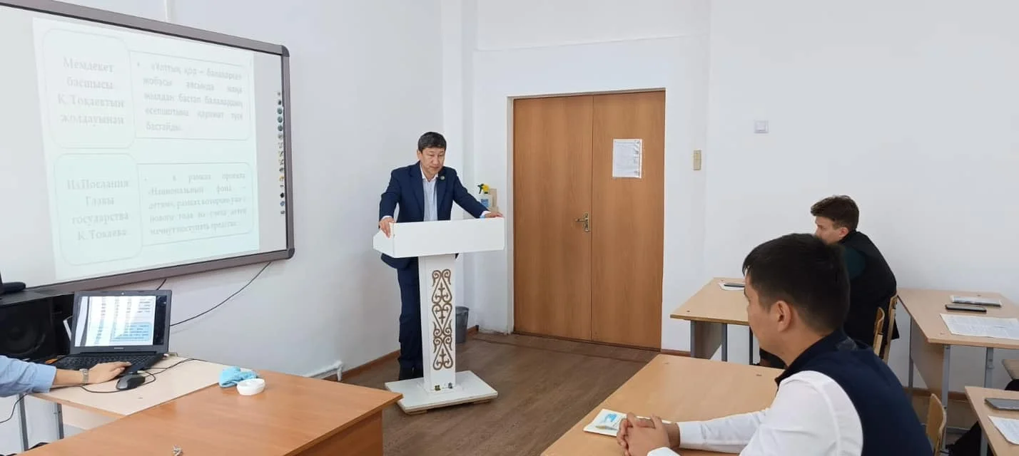 2023 жылдың 11 қыркүйегінде Тарих, география және ӘГП кафедрасында Қазақстан Республикасының Президенті Қасым-Жомарт Тоқаевтың «Әділетті Қазақстанның экономикалық бағдары» атты Қазақстан халқына жолдауына орай кураторлық сағат өткізілді. Кураторлық сағатқа кафедра меңгерушісі т.ғ.к. Өтегенов Марат Зеннатұлы, аға оқытушы Жахина Айнур Курманбаевна және “Ғылыми тарих” мамандығының 2 курс студенттерімен (ИстНК-221, ИстНР-222 топтары) бірге, куратор Киккаринов Еркін Баяхметұлы қатысты. Кураторлық сағаттың мақсаты - Жолдаудың мақсатын, міндеттерін, мазмұнын студенттермен бірге талқылау болды.Іс-шара кафедра меңгерушісі т.ғ.к. Өтегенов Марат Зеннатұлының кіріспе сөзімен ашылды. «Президент Жолдауы – еліміздің жыл сайынғы даму стратегиясын айқындап беретін маңызды құжат. Мемлекет басшысының әр жылғы Жолдауында Үкімет алдына қойған міндеттер кезең-кезеңімен орындалып, өз нәтижелерін беріп келеді». Құжатта ең басты міндет – халықтың әл-ауқатын көтеру екені айрықша айтылып, осы мақсатқа қол жеткізу үшін бірқатар міндеттер белгіленгенін атап өтті. Тарихшы студенттерге заманауи білім алу қажеттігі, рухани дамуына кафедра ПОҚ құрамы тарапынан қолдау көрсетілетіндігі айтылды.Кураторлық сағатта студенттер тарапынан қысқаша баяндамалар жасалып, Жолдау толықтай талқыланды. ИстНР-222 тобының студенті Ержанова Салина Президент жолдауы жайында баяндама оқыды. Сонымен қатар, Қайырлы Әлихан, Алдамжарова Дарина тарапынан сұрақтар қойылып, оларға жауаптар қайтарылды.ИстНК-221, ИстНР-222 тобының кураторы, Тарих, география және ӘГП кафедрасының оқытушысы Киккаринов Еркін Баяхметұлы өтілген кураторлық сағат барысында студенттермен жасалған жұмысқа баға бере отырып, қорытынды сөз сөйледі.