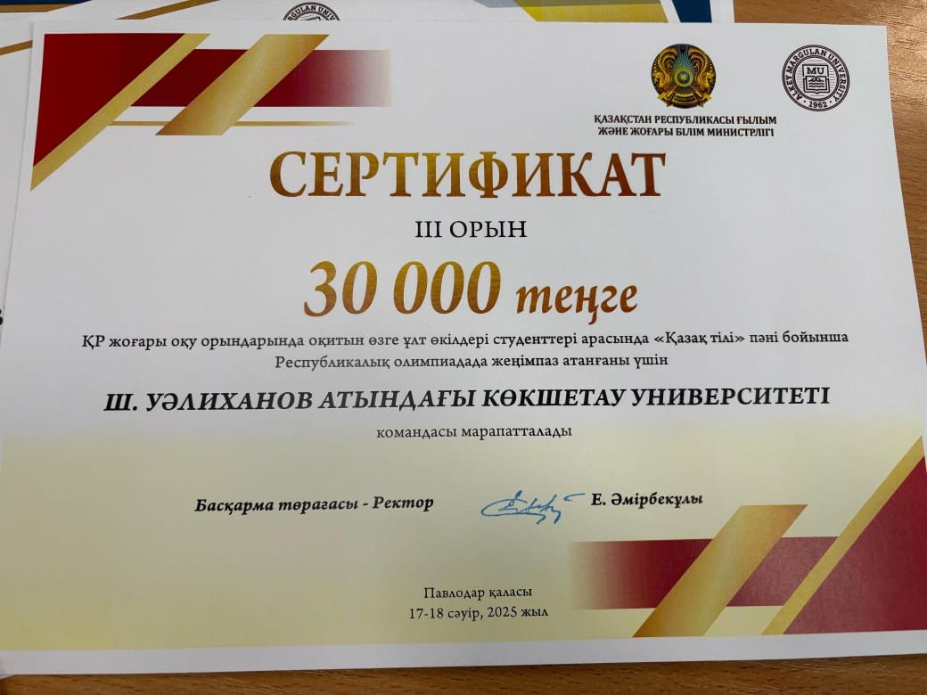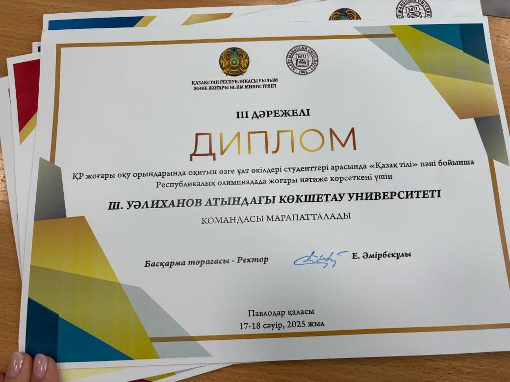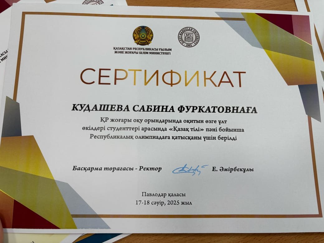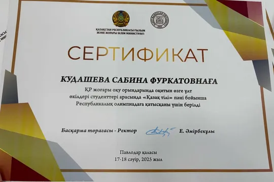 17-18 сәуір аралығында Әлкей Марғұлан атындағы Павлодар педагогикалық университетінде қазақ тілінен Республикалық олимпиада өтті. Медицина жоғары мектебінің атынан 1 курс Медр-241 тобының студенті Кудашева Сабина лайықты сөз сөйледі. Табанды зияткерлік күресте ол "Мәңгілік ел ұрпақтары" беделді номинациясы бойынша жалпы командалық үшінші орынға ие болып, қазақ тіліне деген тамаша білімін, шығармашылығы мен сүйіспеншілігін көрсетті. Іс-шараға еліміздің түкпір-түкпірінен келген жоғары оқу орындарының студенттері қатысып, Ана тілі мен мәдениетіне жоғары дайындық пен қызығушылық танытты.Сабинаны осы жетістігімен құттықтаймыз және одан әрі табыстар мен жаңа жеңістер тілейміз!