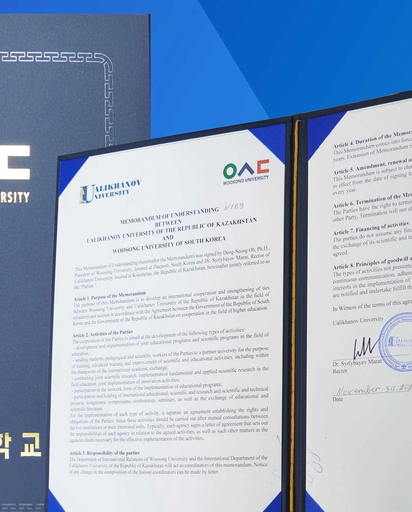 2022 жылғы 29 қараша мен 03 желтоқсан аралығында ректор МаратСырлыбаев бастаған Ualikhanov University делегациясы Оңтүстік Кореяның Тэджонжәне Сеул қалаларындағы 5 жоғары оқу орнына барды. Делегация құрамынаакадемиялық мәселелер жөніндегі проректор Нұрлан Медетов жәнеинтернационалдандыру және инфрақұрылымды дамыту жөніндегі проректорЖайлагүл Сағындықова болды.