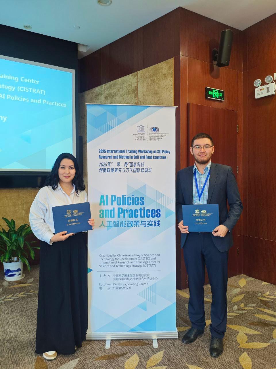 2025 жылғы 30 шілде мен 15 тамыз аралығында қауымдастырылған профессор Сабитова Д.С. және цифрландыру бөлімінің аға бағдарламашысы Альмусаев О.С. Қытай ғылым және технология академиясы (CASTED) жанындағы Ғылым мен технология стратегиясы жөніндегі халықаралық зерттеу және даярлау орталығы (CISTRAT) ұйымдастырған CISTRAT International Training Workshop “AI Policies and Practices” халықаралық оқу семинарына қатысты.Семинар ЮНЕСКО қолдауымен өткізіліп, ғылым, технология және инновациялар (STI) саласындағы ұлттық стратегияларды дамытуға, әсіресе жасанды интеллекттің (AI) қарқынды дамуы аясында бағытталды. Шара 15 елдің өкілдерін жинап, AI реттеу, STI-саясат, халықаралық ынтымақтастық және тұрақты даму бойынша тәжірибе алмасуға алаң болды.