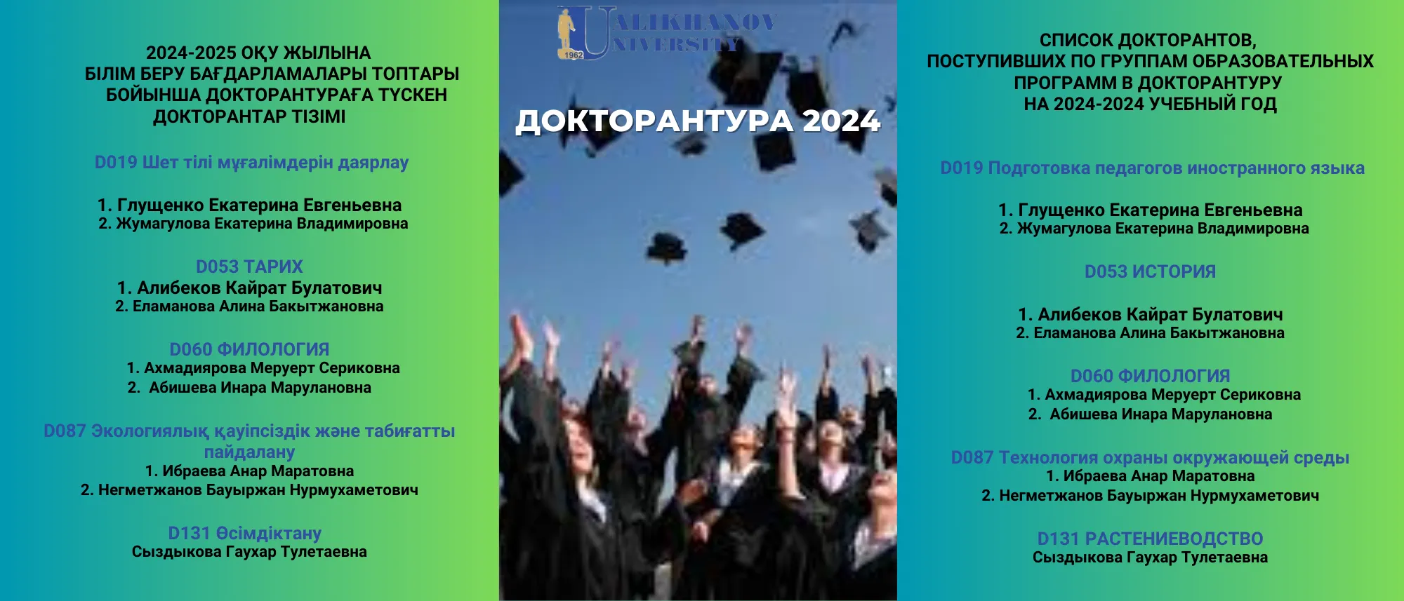 Жұма күні университетте докторантураға мақсатты гранттарды бөлу конкурсы аяқталды, оған 75 өту балды жинаған 10 талапкер қатысты. Конкурстық комиссия отырысының қорытындысы бойынша келесі үміткерлерге мемлекеттік гранттар берілді: