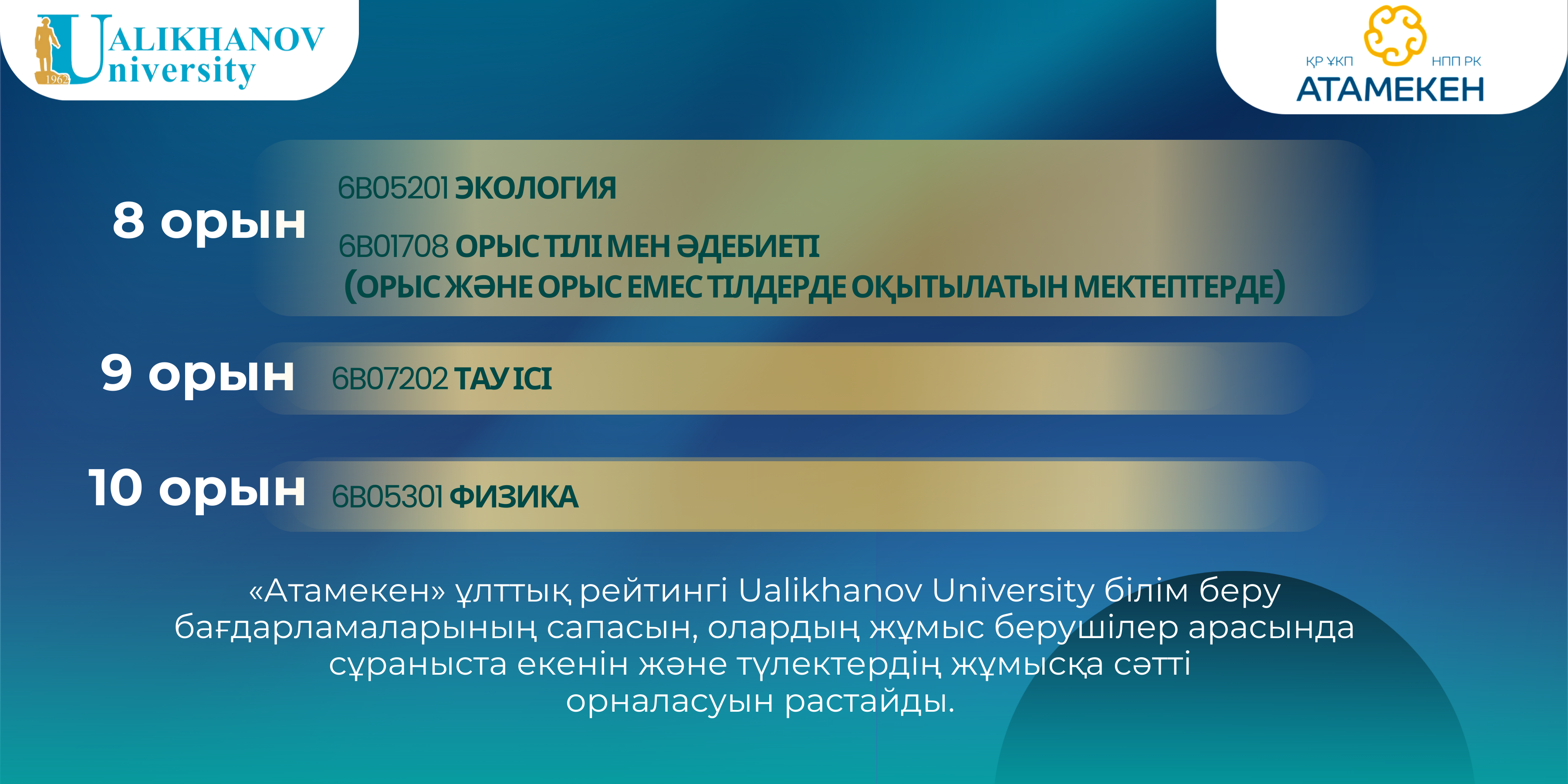 Ualikhanov University 2026 жылғы «Атамекен» Ұлттық кәсіпкерлер палатасының білім беру бағдарламаларының ұлттық рейтингінде ТОП-10 қатарына енді. Университеттің бірқатар білім беру бағдарламалары Қазақстан Республикасындағы үздік білім беру бағдарламаларының қатарына еніп, мамандар даярлау сапасының жоғары деңгейін көрсетті.