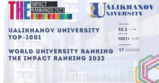 Ualikhanov University Times Higher Education Impact Ranking 2023 әлемдік рейтингіндегі 110 елдің университеттері арасында топ-1000-ға кірді. Қазақстандық жоғары оқу орындарының ішінде Ualikhanov University үздік нәтижелерді көрсете отырып, топ-10 позициясына ие болды.