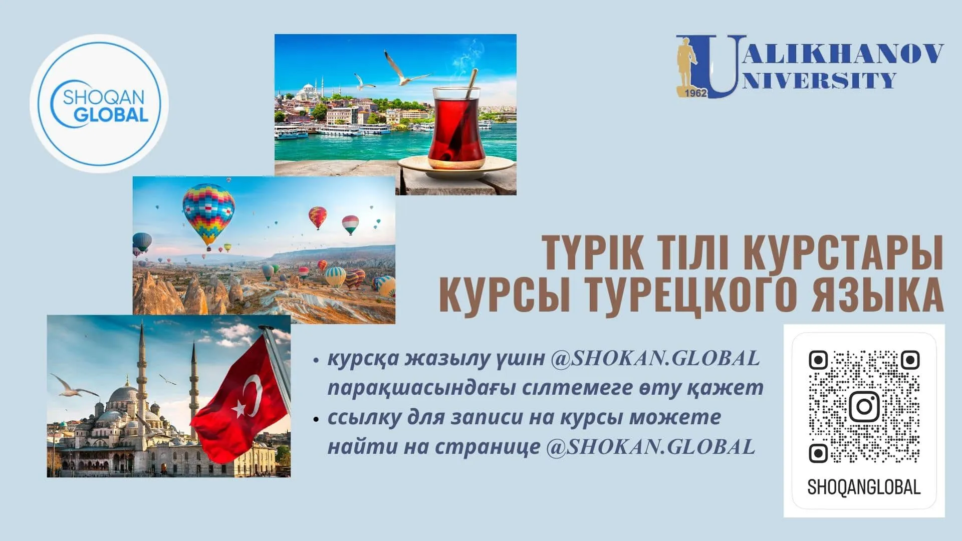 Құрметті студенттер! Түрік тілін үйрететін курсқа жазылу ашылғанын хабарлаймыз. Курсқа жазылу үшін @shokan.global инстаграм парақшасындағы таплинк сілтемесіне өтіп Google form толтыру қажет. Топ жиналғаннан кейін WhatsApp желісінде чат ашылатын болады.