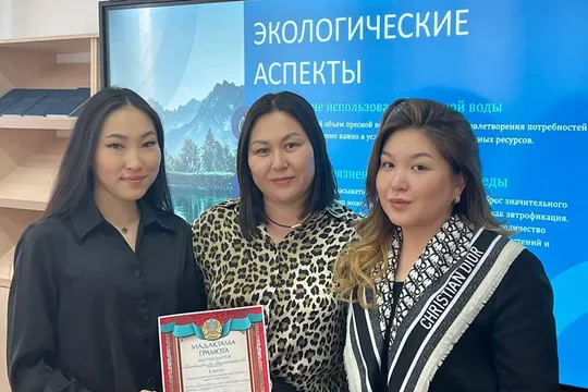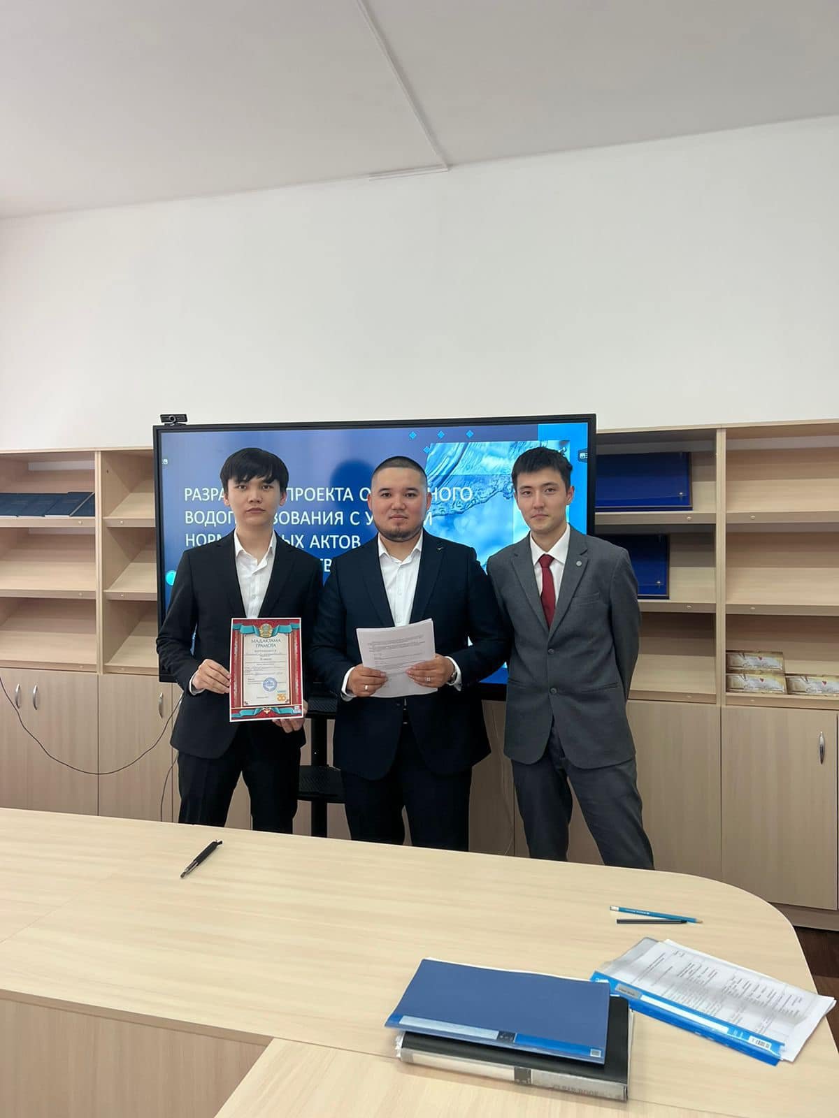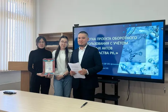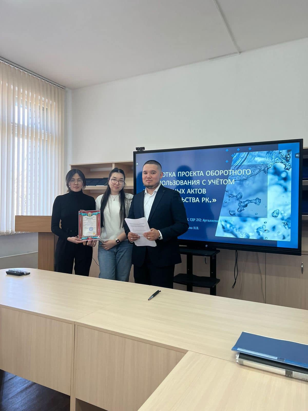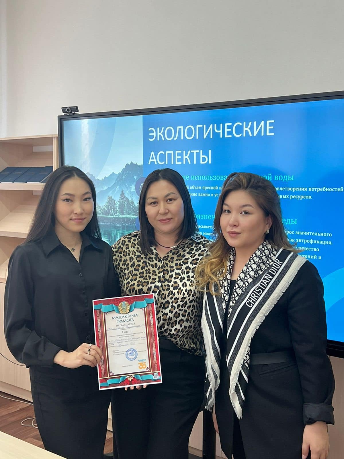 3 дәрежелі диплом: Ауғалиева А., Аманжолова А. жобаның тақырыбы: «Разработка проекта оборотного водопользования с учётом нормативных актов законодательства РК». Ғылыми жетекшісі: Хватина Н. В.