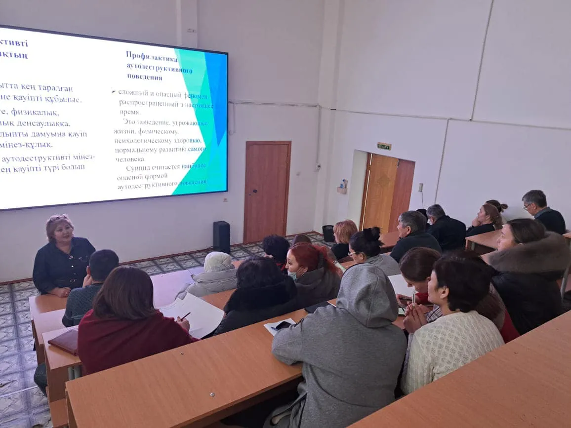 Семинар-практикумға қатысушылар "аутодеструктивті мінез-құлық, суицид" ұғымдарымен танысты. "Автобус аялдамалары" атты практикалық жұмыс барысында студенттер арасындағы суицидтің себептерін, суицидтік мінез-құлық көріністерінің ерекшеліктерін анықтады, суицидтік мінез-құлықпен өзара әрекеттесу және профилактикалық жұмыстарды жүзеге асыру бойынша ұсыныстар әзірледі.