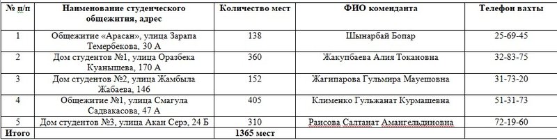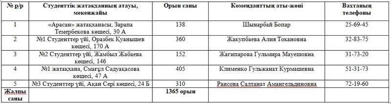 Жатақханаға орналасу кезінде студент медициналық тексеруден өтуі керек. Студент жатақхана комендантына өтініш, жеке куәлік, медициналық анықтама, тұру ақысын төлегені туралы түбіртек береді.