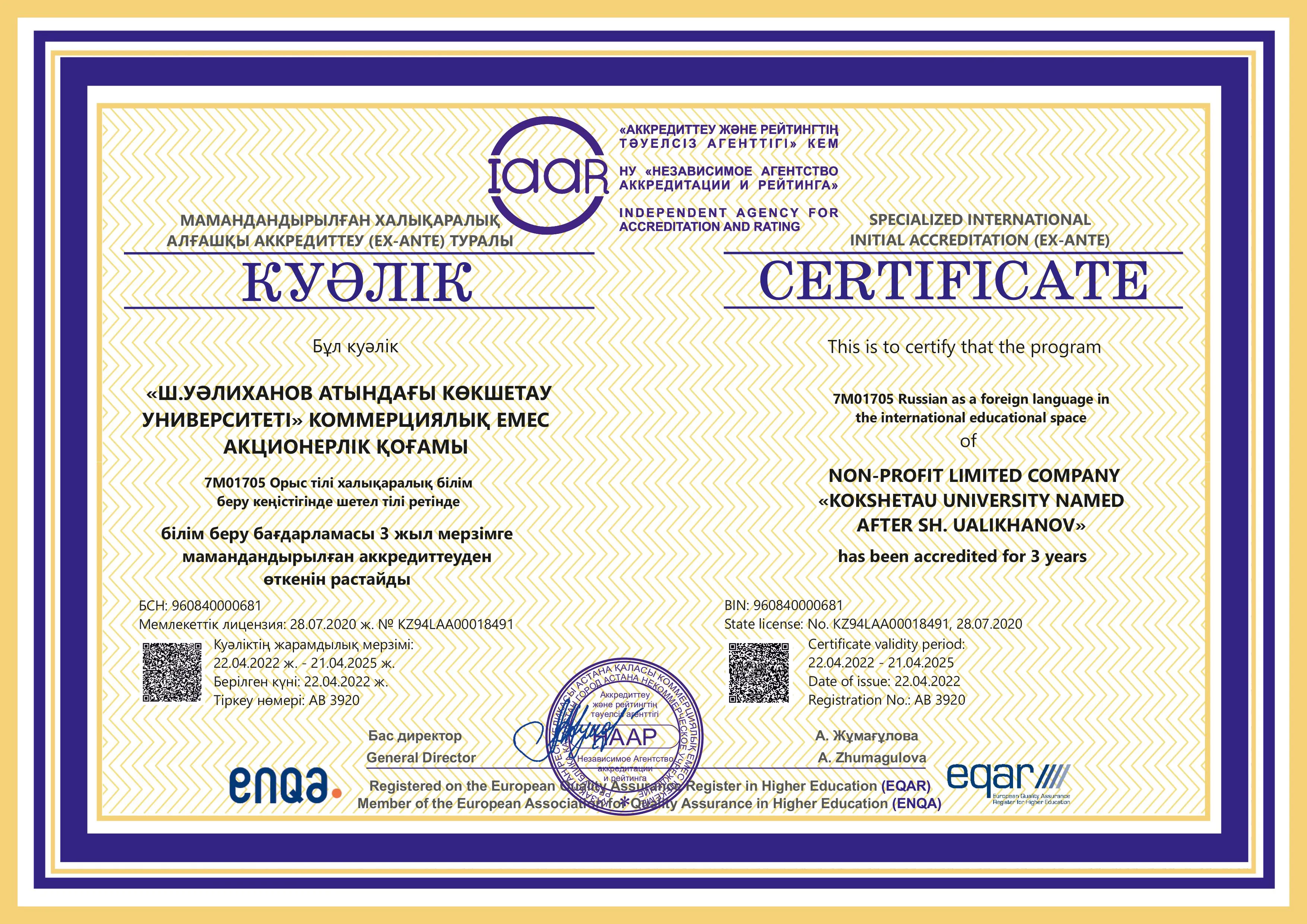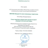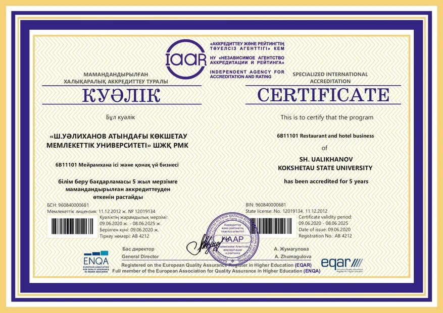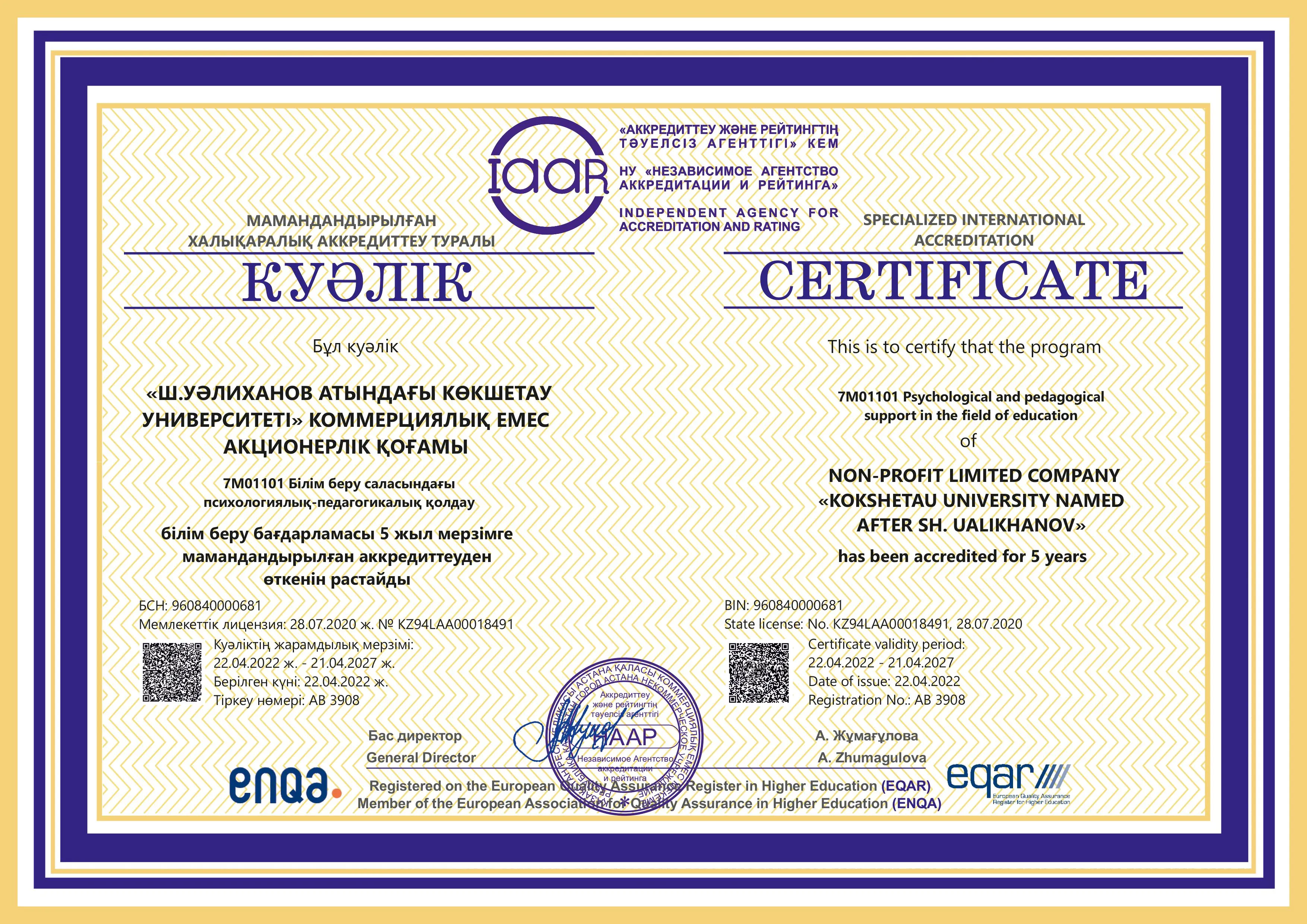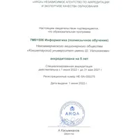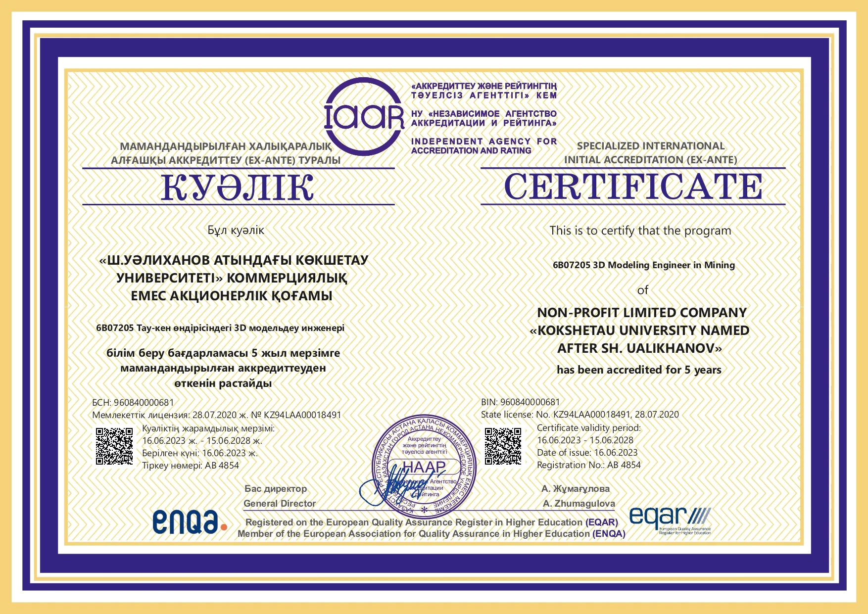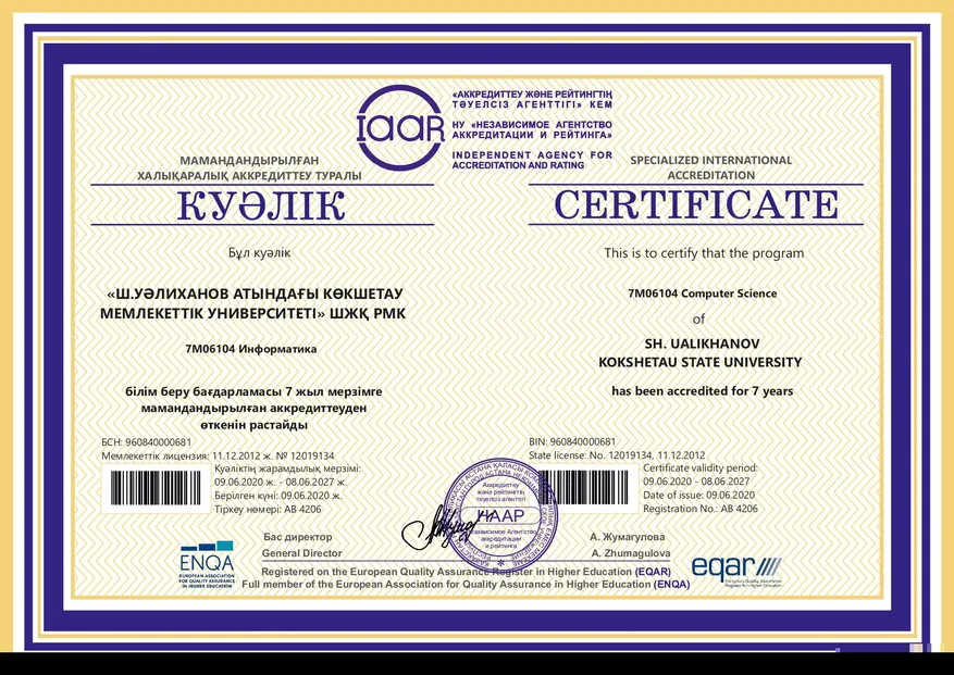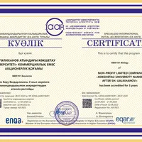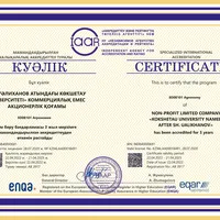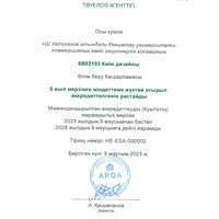 Всего аккредитовано 97% образовательных программ университета в Независимом агентстве аккредитации и рейтинга НААР/IAAR, Независимом агентстве по аккредитации и экспертизе качества образования ARQA, Казахстанской Ассоциации элитного образования KAZSEE.
