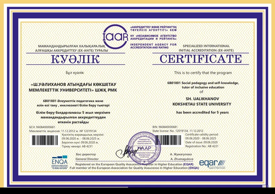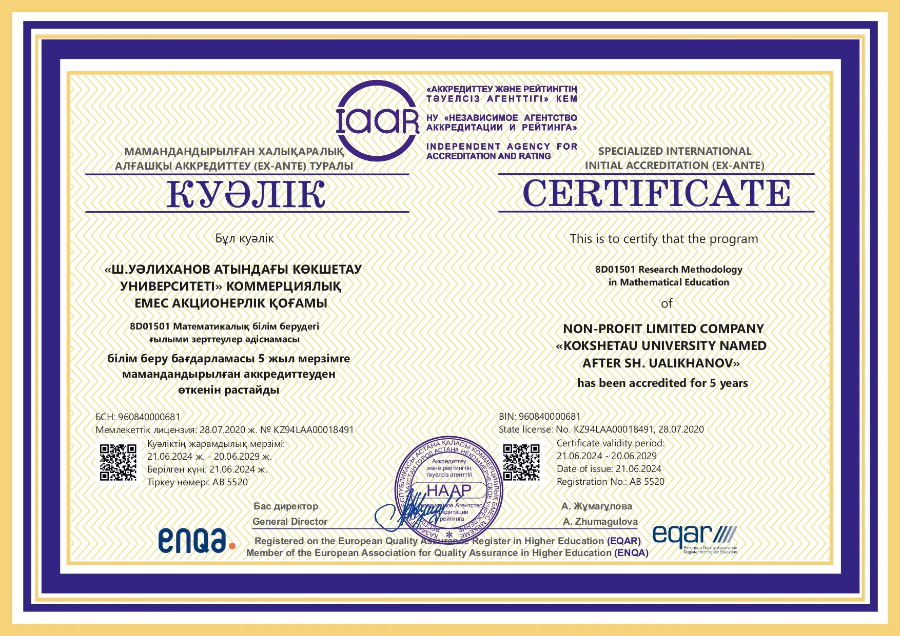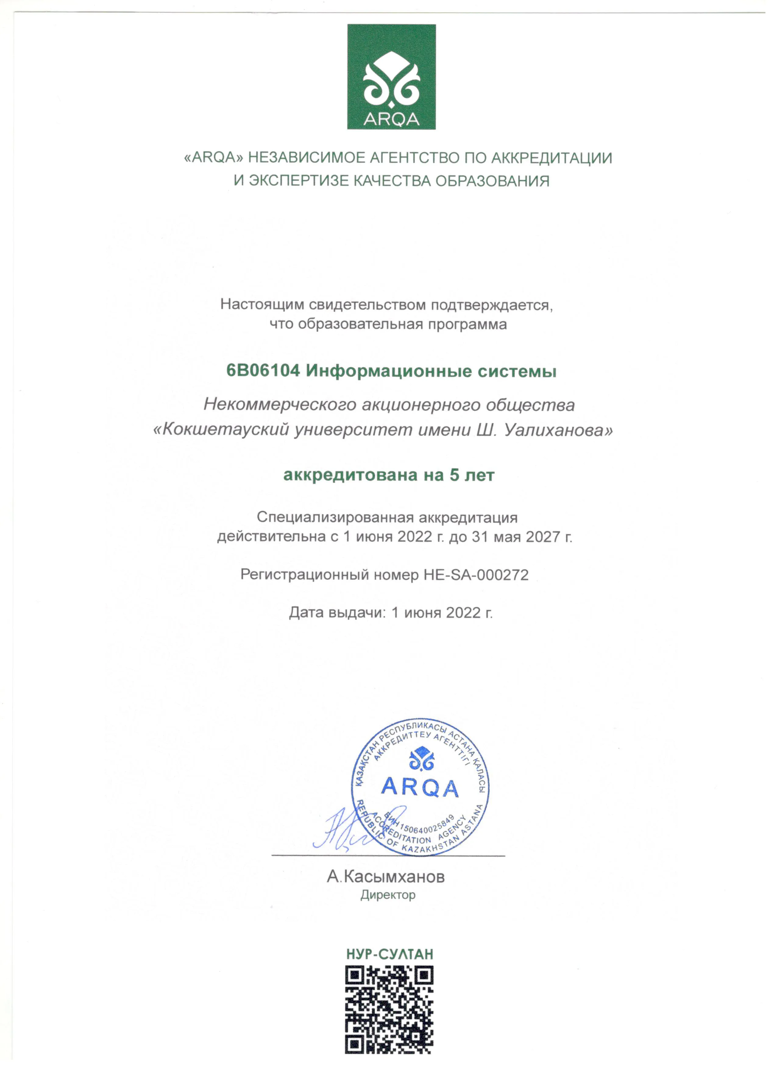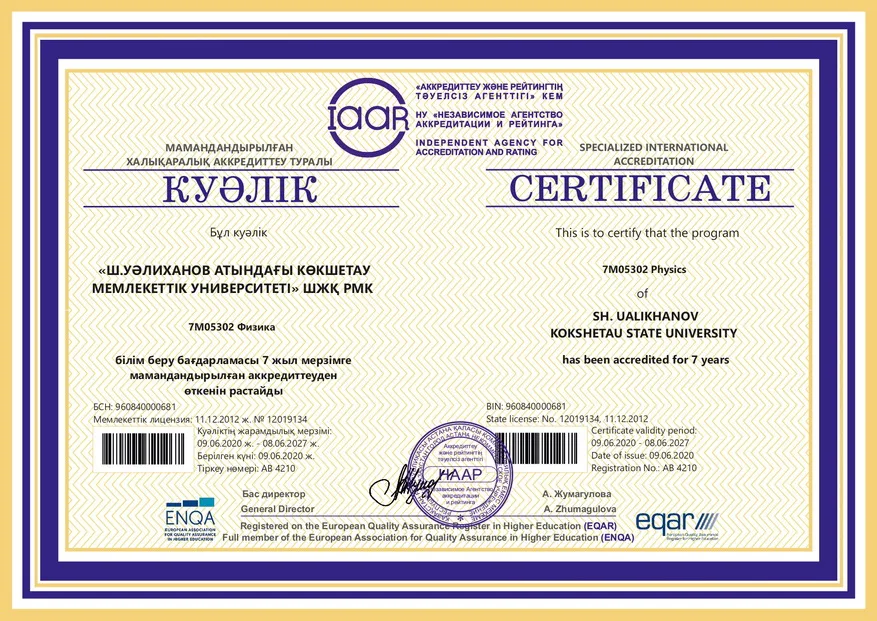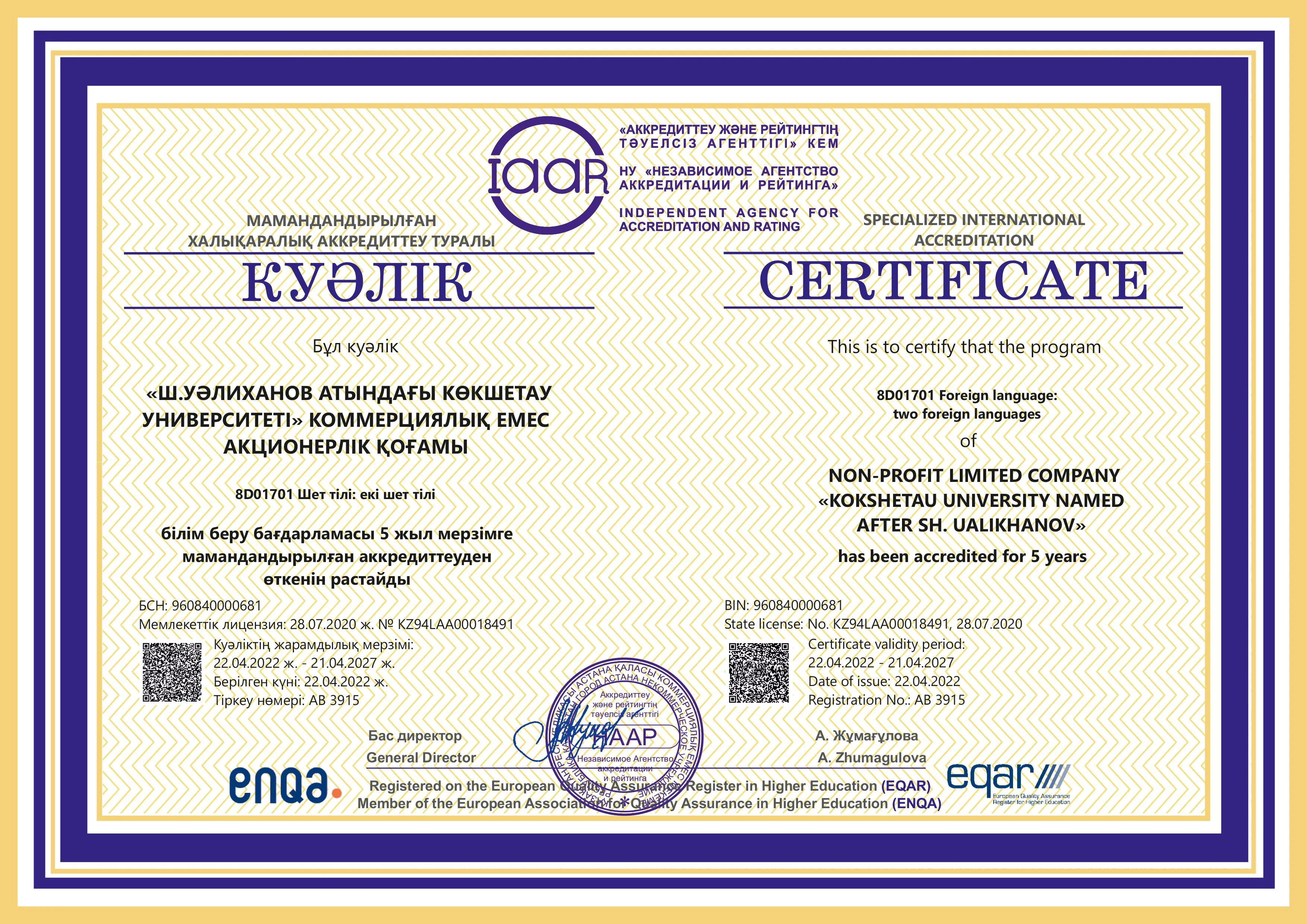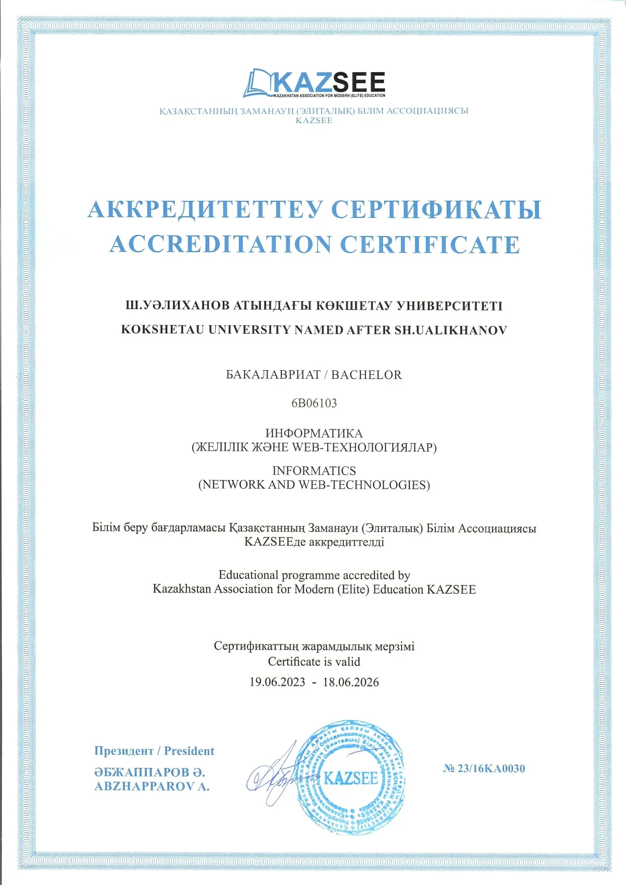 Всего аккредитовано 97% образовательных программ университета в Независимом агентстве аккредитации и рейтинга НААР/IAAR, Независимом агентстве по аккредитации и экспертизе качества образования ARQA, Казахстанской Ассоциации элитного образования KAZSEE.