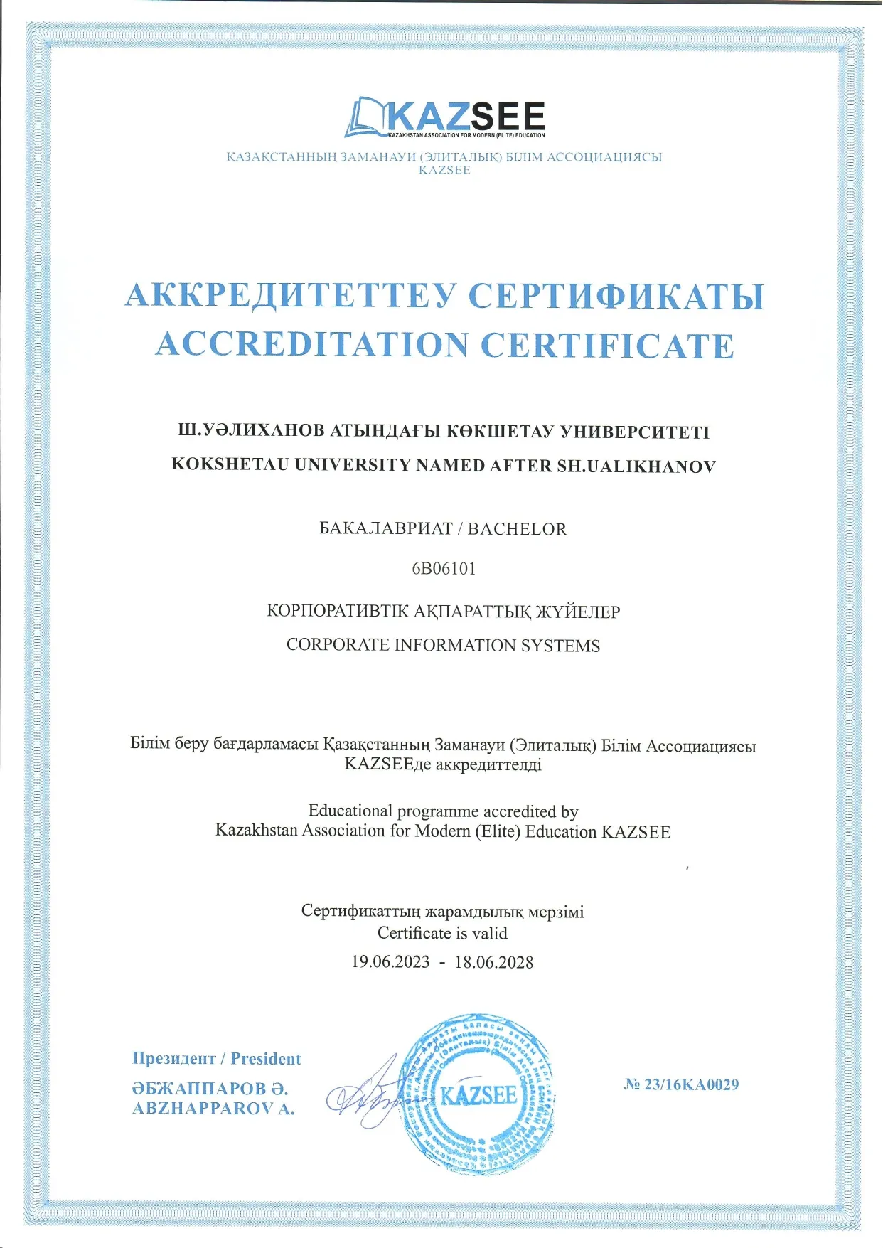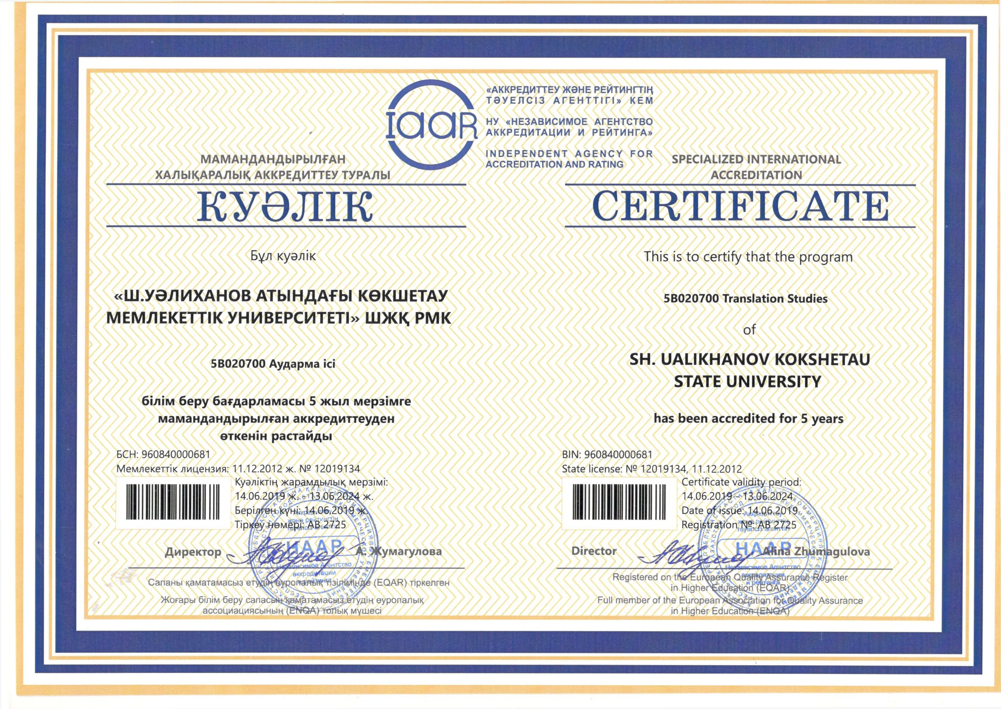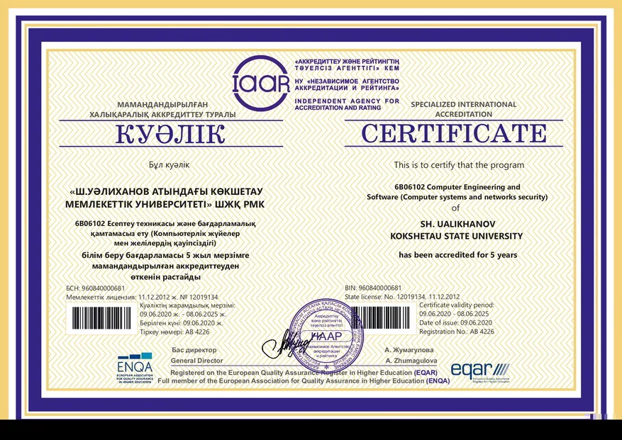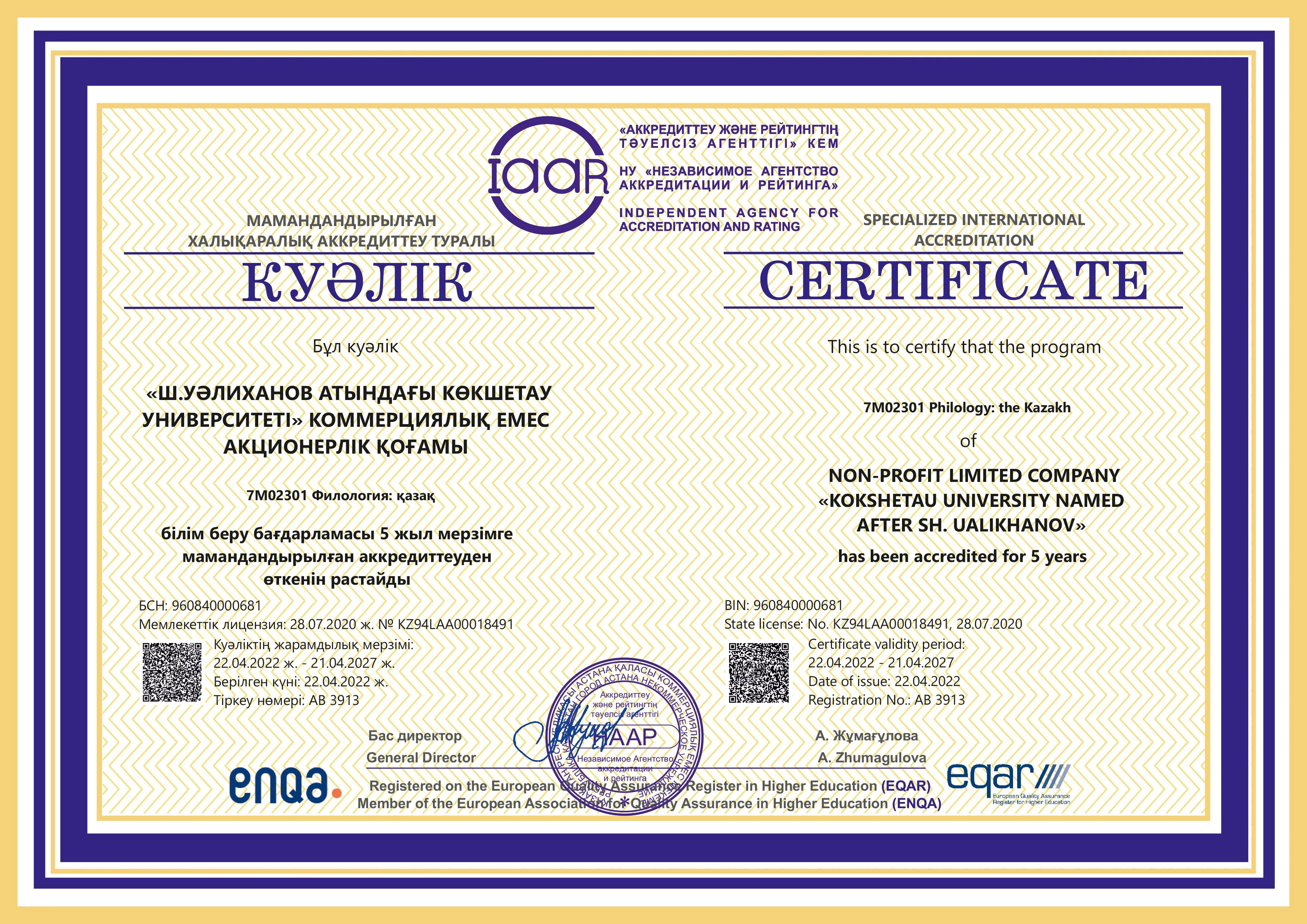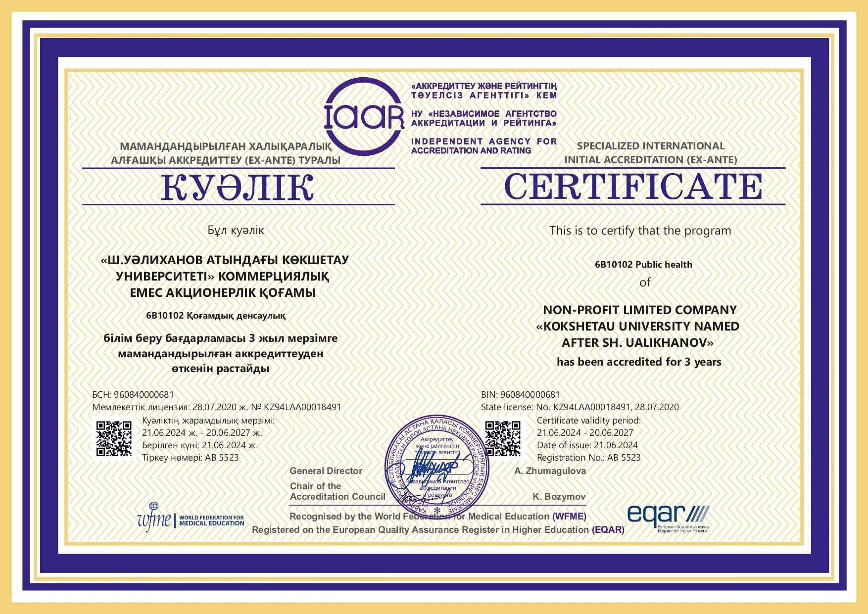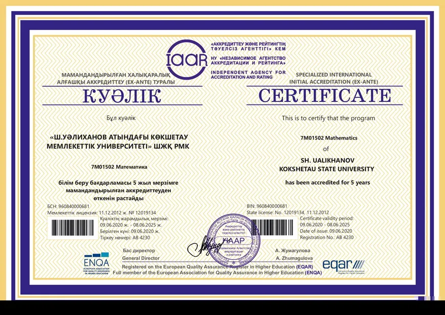 Всего аккредитовано 97% образовательных программ университета в Независимом агентстве аккредитации и рейтинга НААР/IAAR, Независимом агентстве по аккредитации и экспертизе качества образования ARQA, Казахстанской Ассоциации элитного образования KAZSEE.