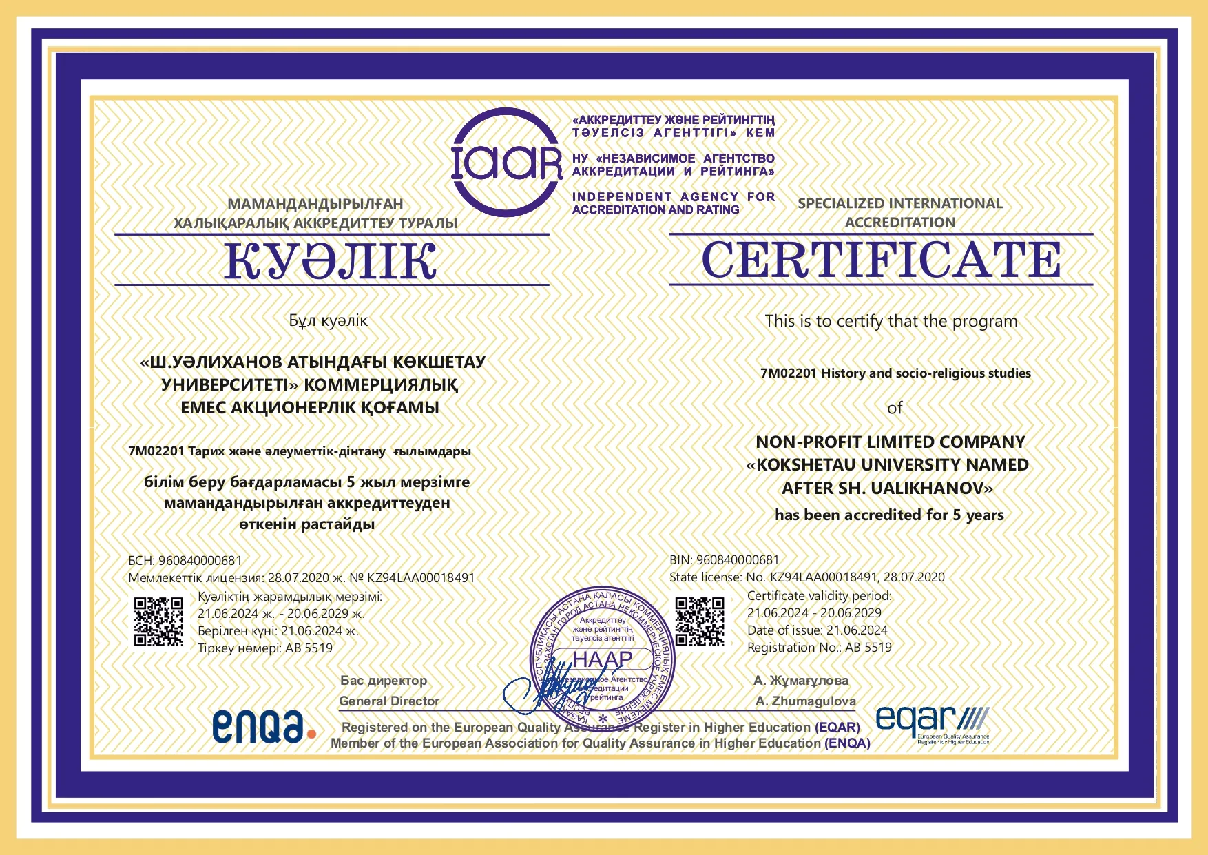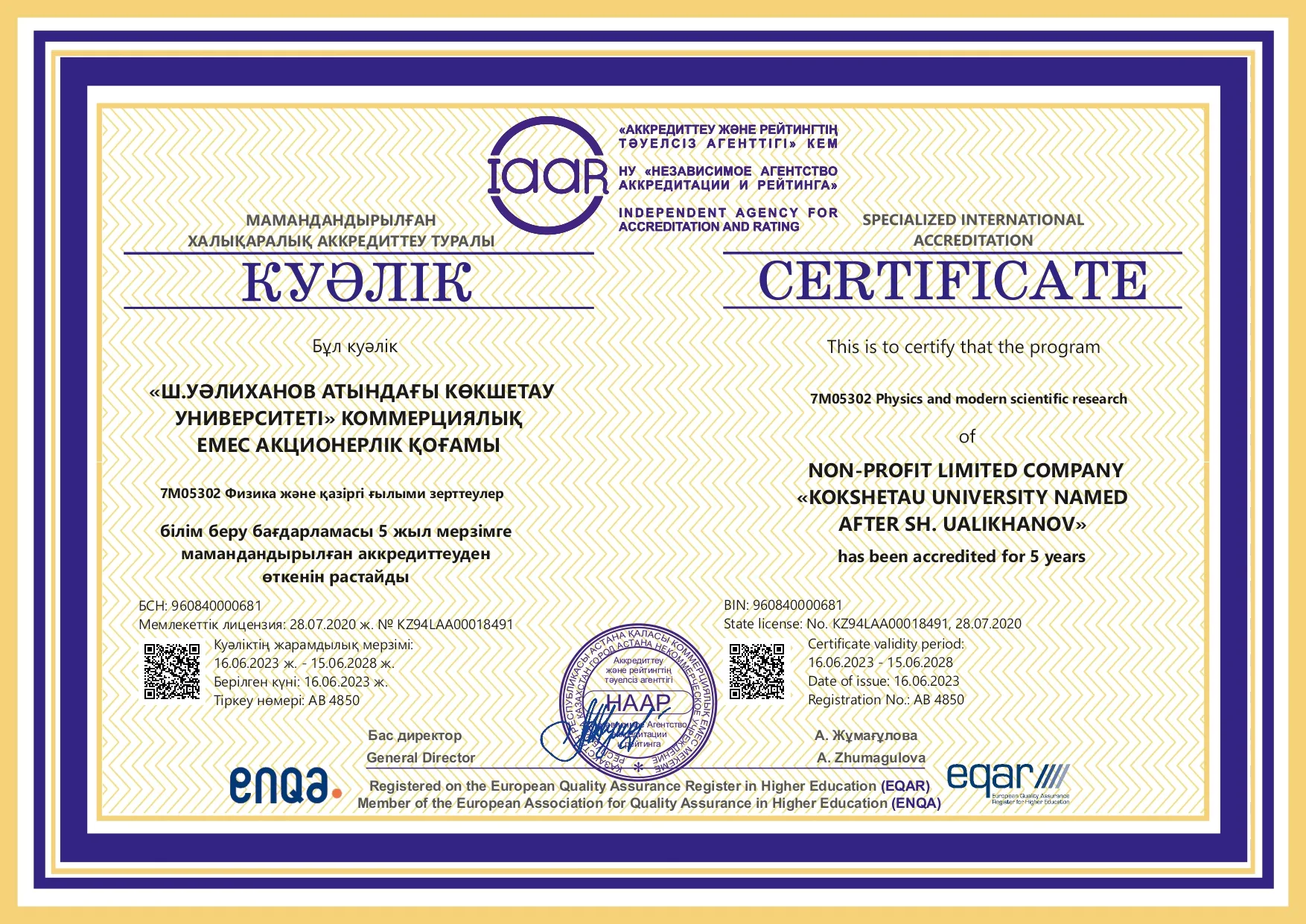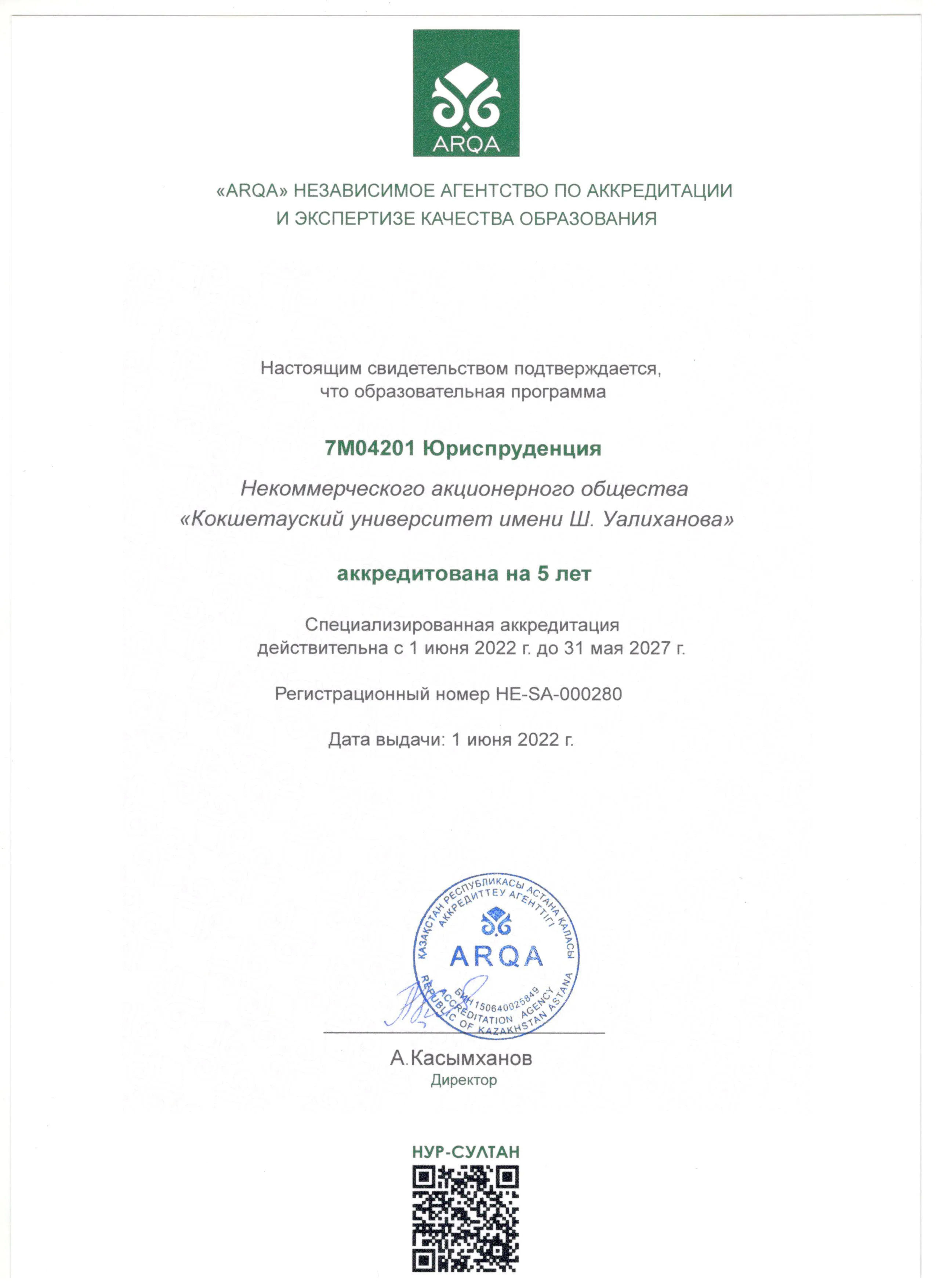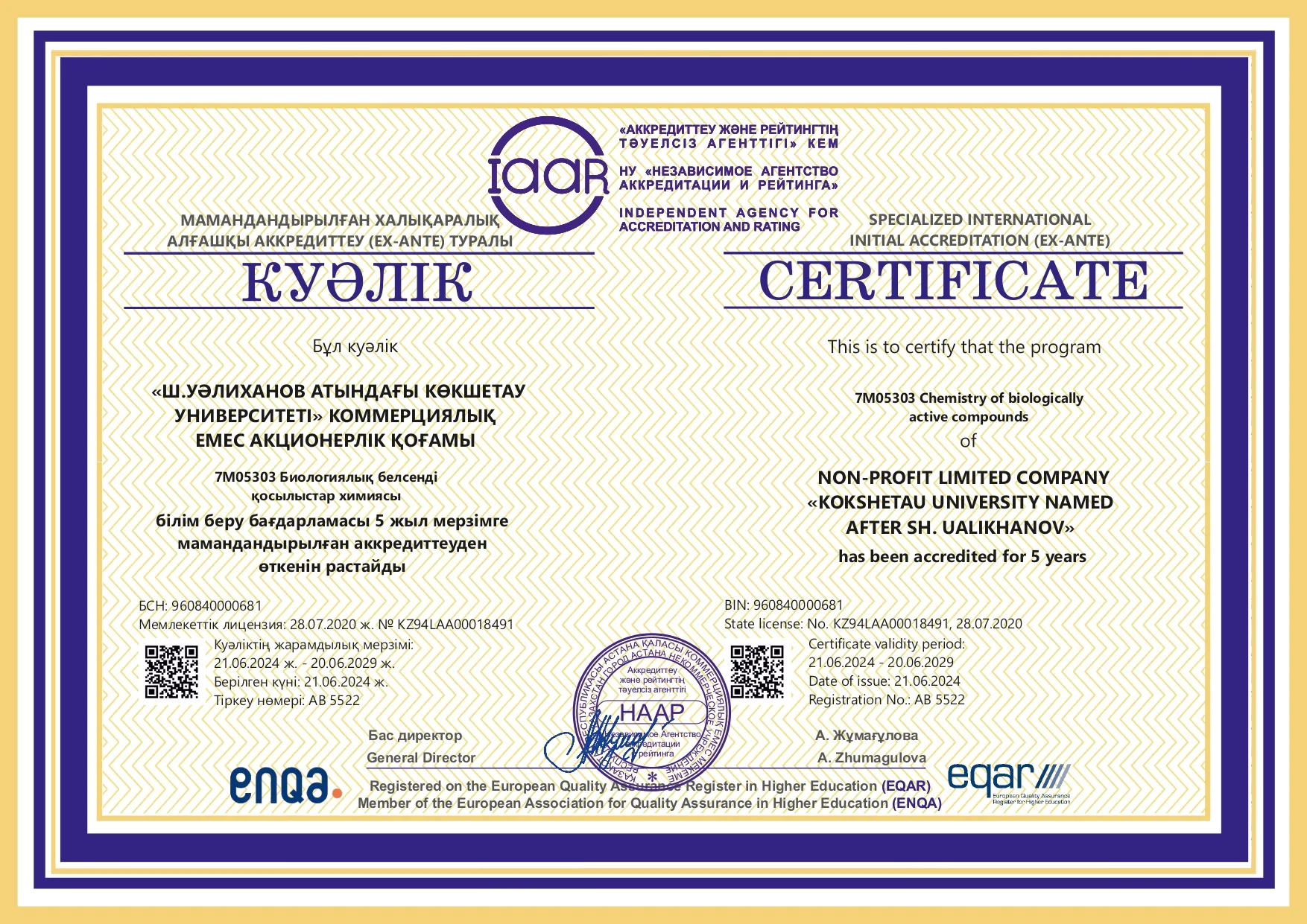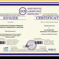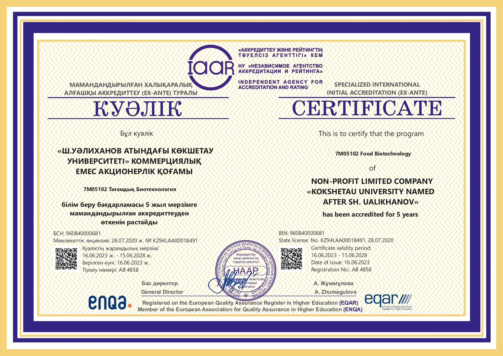 Всего аккредитовано 97% образовательных программ университета в Независимом агентстве аккредитации и рейтинга НААР/IAAR, Независимом агентстве по аккредитации и экспертизе качества образования ARQA, Казахстанской Ассоциации элитного образования KAZSEE.