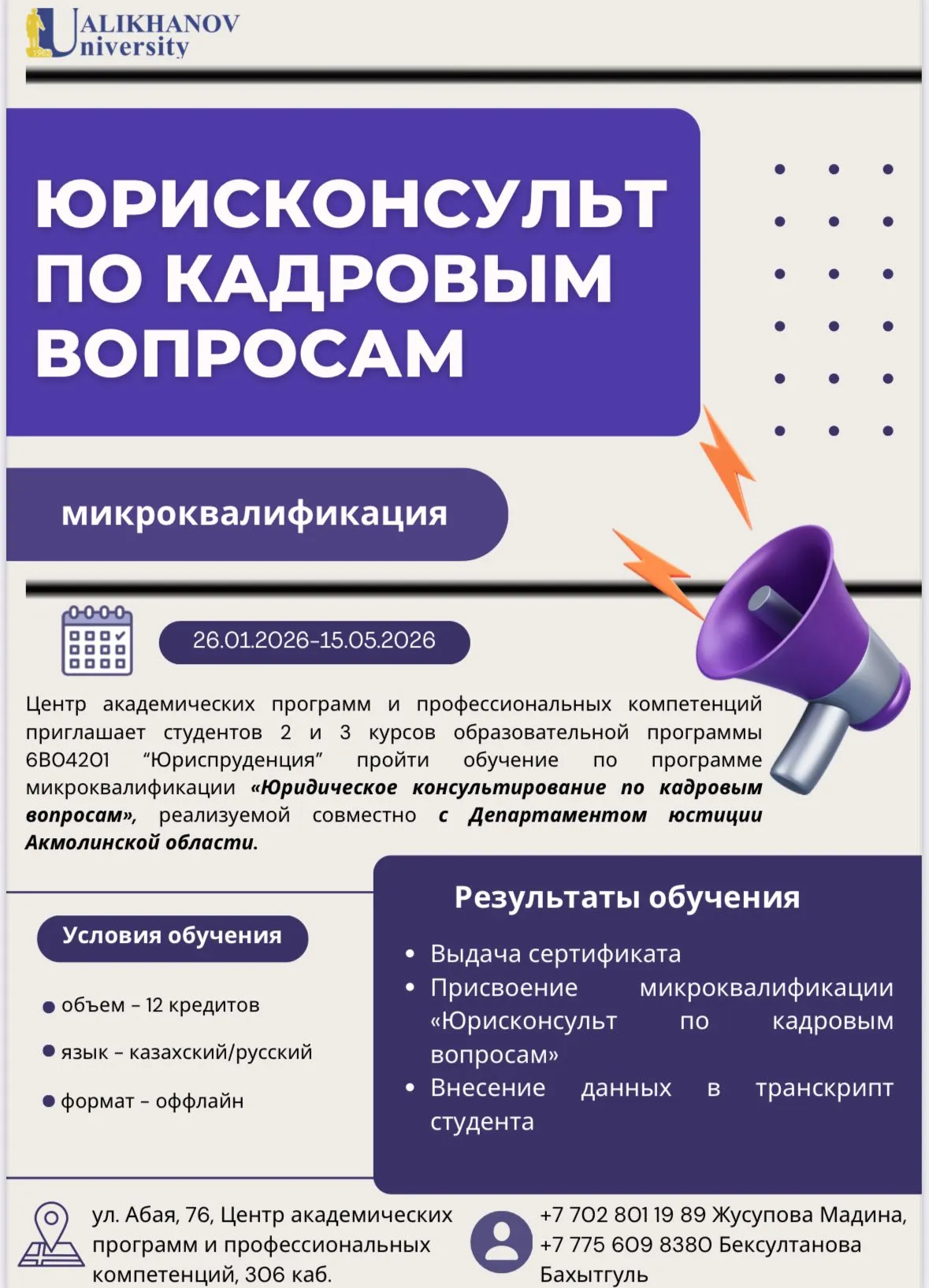 Центр академических программ и профессиональных компетенций приглашает студентов 2 и 3 курсов образовательной программы 6В04201 «Юриспруденция» пройти обучение по программе микроквалификации «Юридическое консультирование по кадровым вопросам», реализуемой совместно с Департаментом юстиции Акмолинской области.