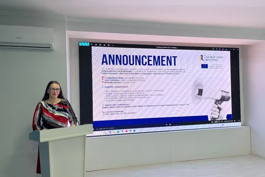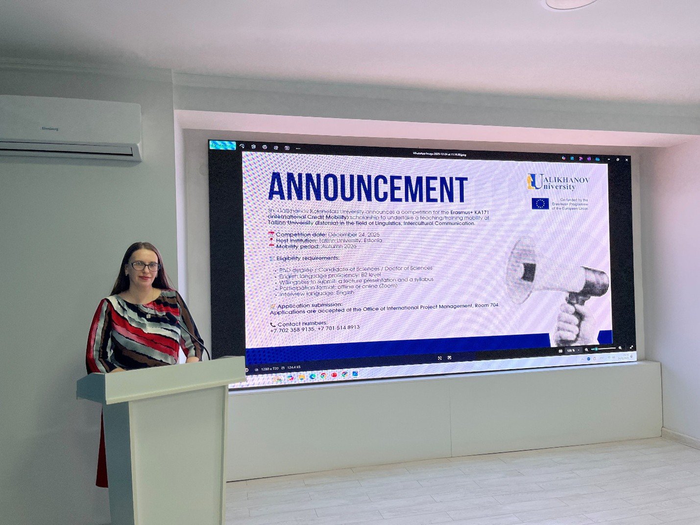 24 декабря 2025 года в Кокшетауском университете им. Ш.Уалиханова был проведен конкурс для преподавателей Кафедры английского языка и методики преподавания и Кафедры общего языкознания и литературы на получение стипендии Erasmus+ KA1 (Международная кредитная мобильность) для прохождения стажировки в Таллиннском университете (г.Таллин, Эстония). По итогам конкурса обладателем стипендии Erasmus+ KA1 (International Credit Mobility) стала – Михайлова Татьяна Владимировна, ассистент профессора кафедры английского языка и методики преподавания. Международная стажировка будет проведена в ноябре 2026 года.